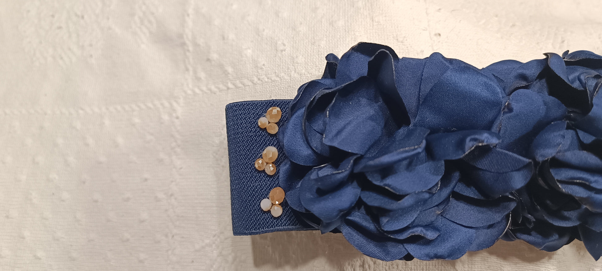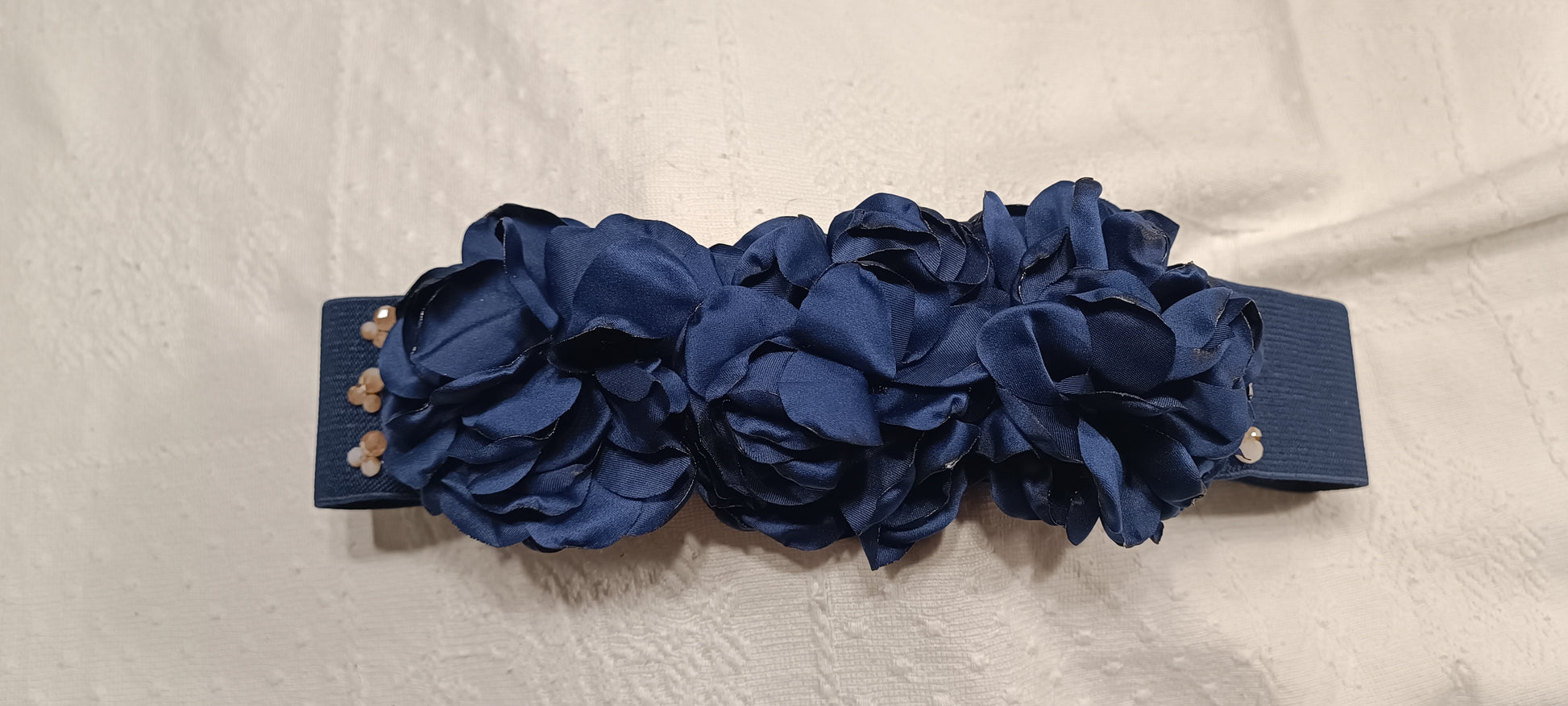 Cinturón de tela elástica hecho a mano, con flores de tela y cuentas de cristal facetado al rededor. Ideal para cualquier evento.