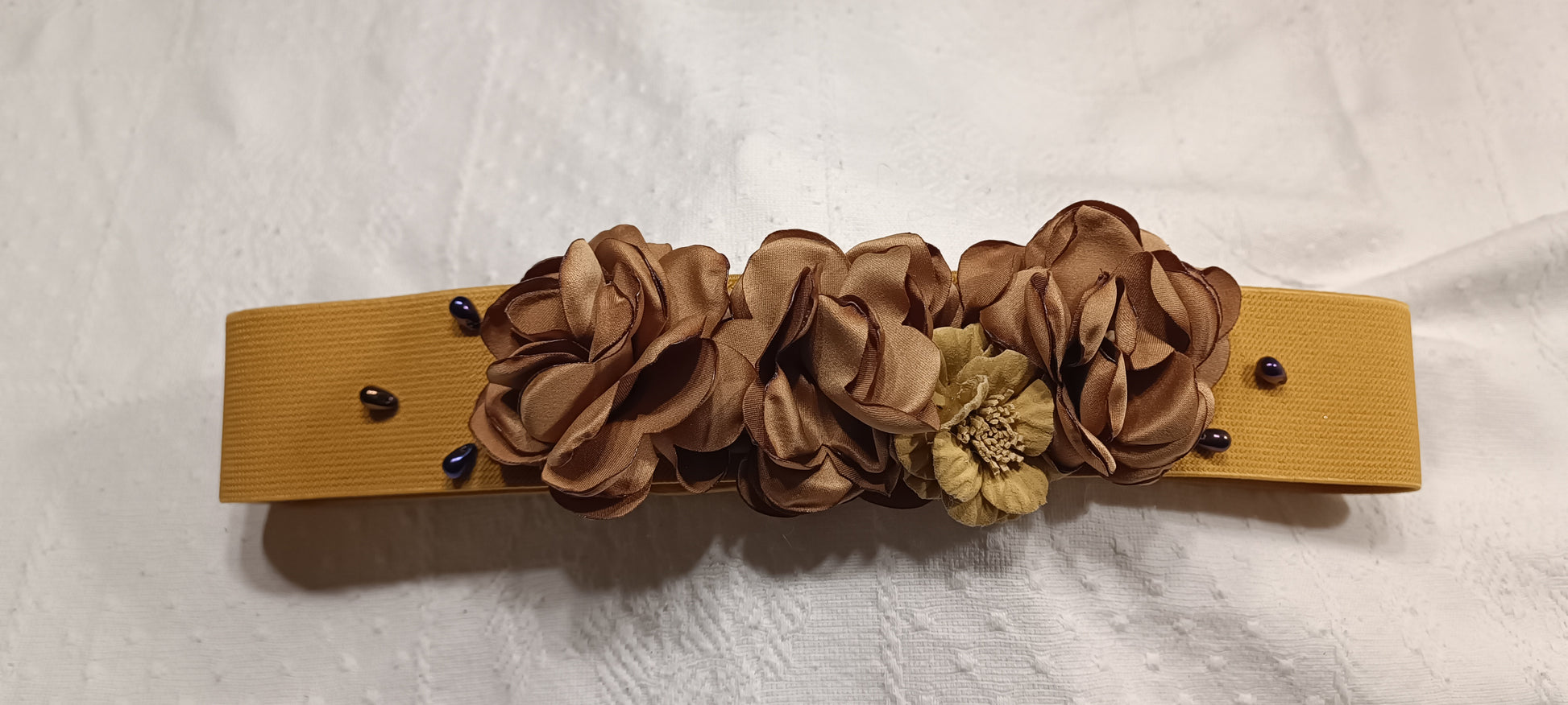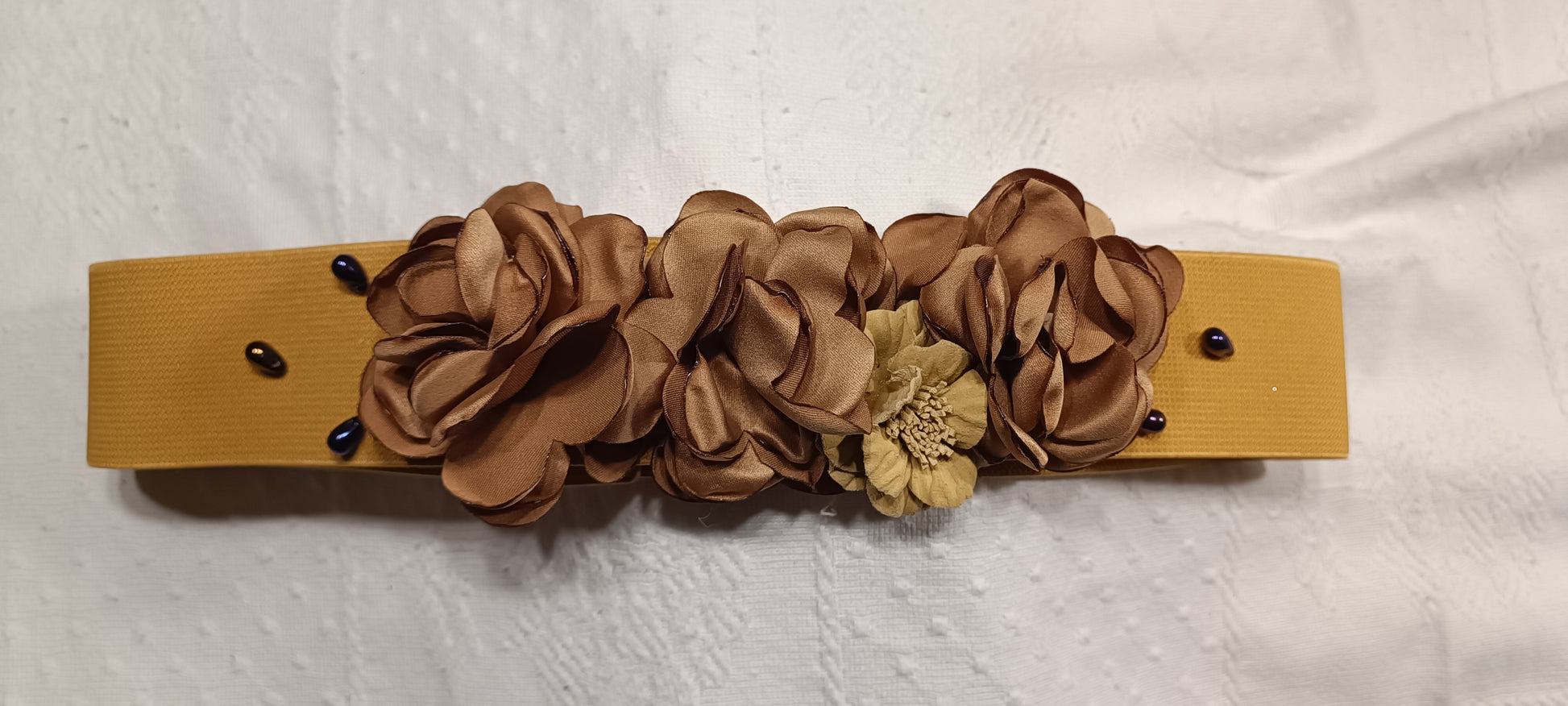 Cinturón hecho a mano de color mostaza, con flores de color marrón y vainilla. En los laterales de las flores, tiene cosidas unas lágrimas de cristal en tonos morados, que combinan perfectamente con los colores base del cinturón.
