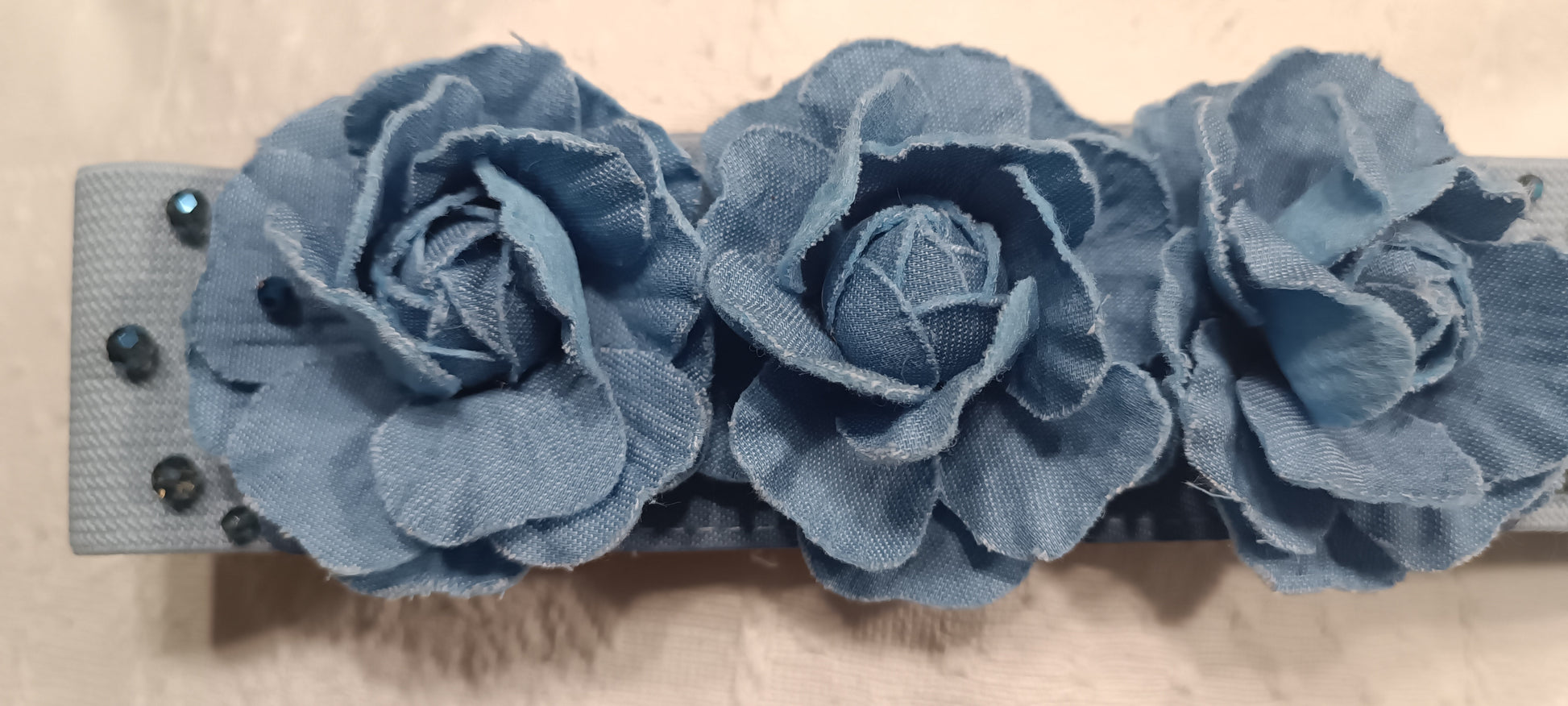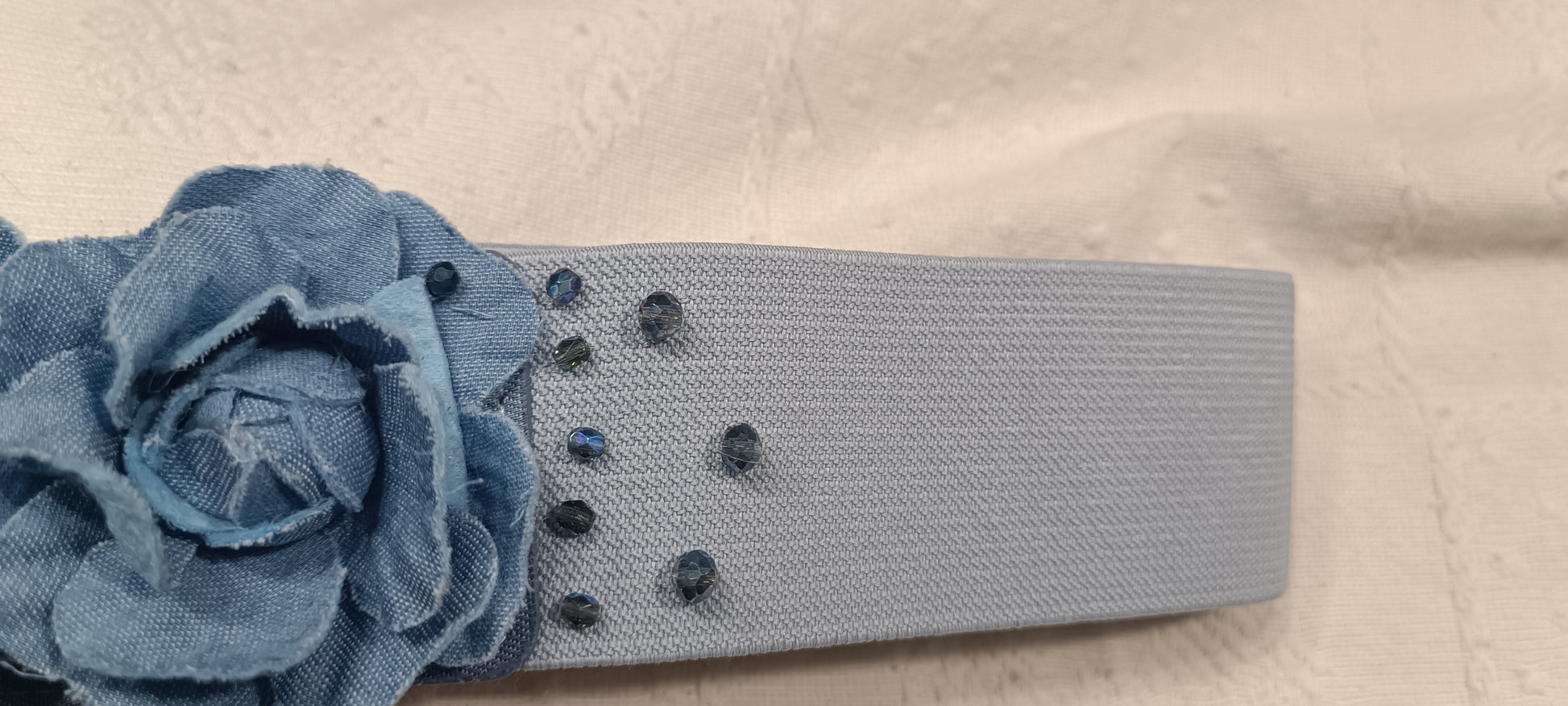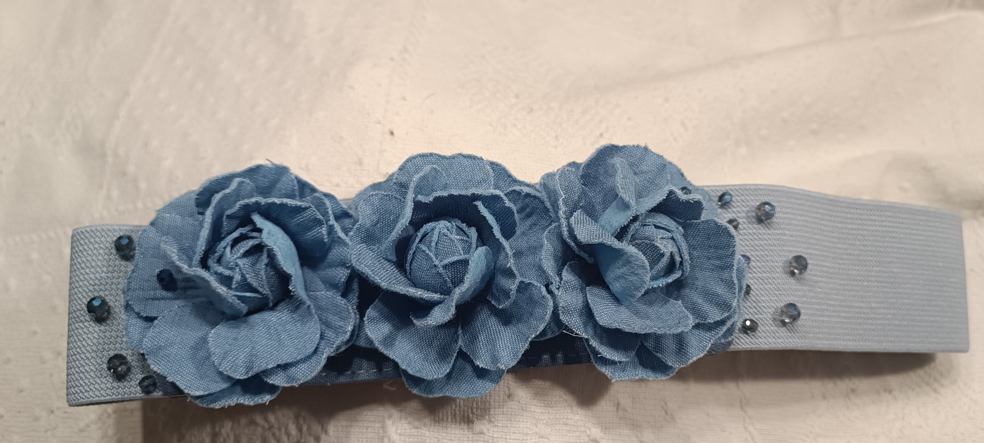 Cinturón de tela elástica hecho a mano, con flores de tela y cuentas de cristal facetado al rededor. Ideal para cualquier evento.