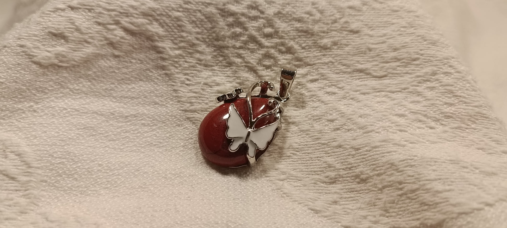 Colgante en forma de lágrima de acero inoxidable con mariposa y piedra natural.