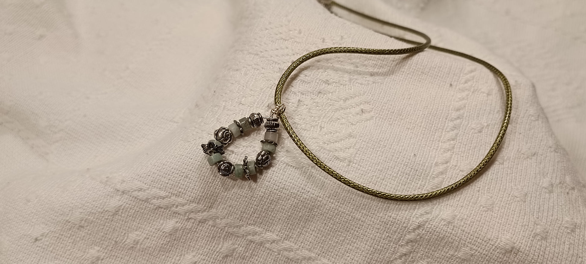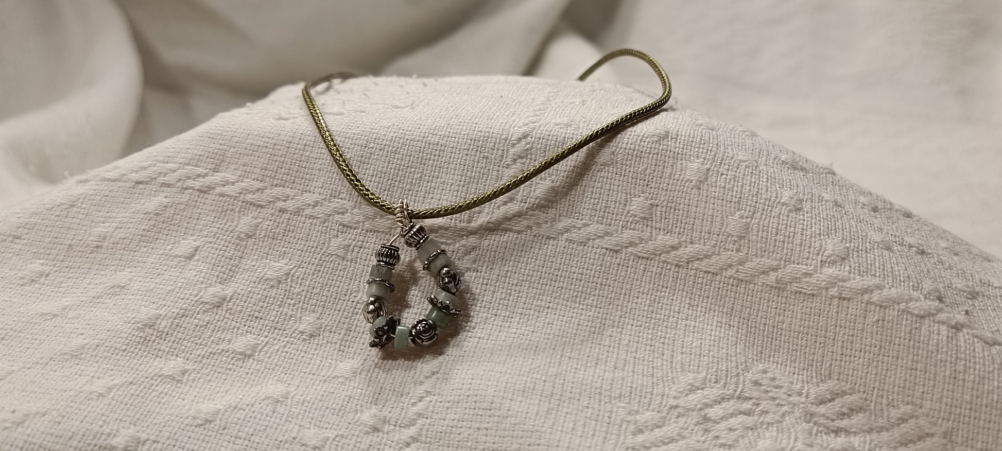 Colgante en forma de aro. Compuesto por alambre de acero inoxidable, cuentas metálicas y de piedras naturales.