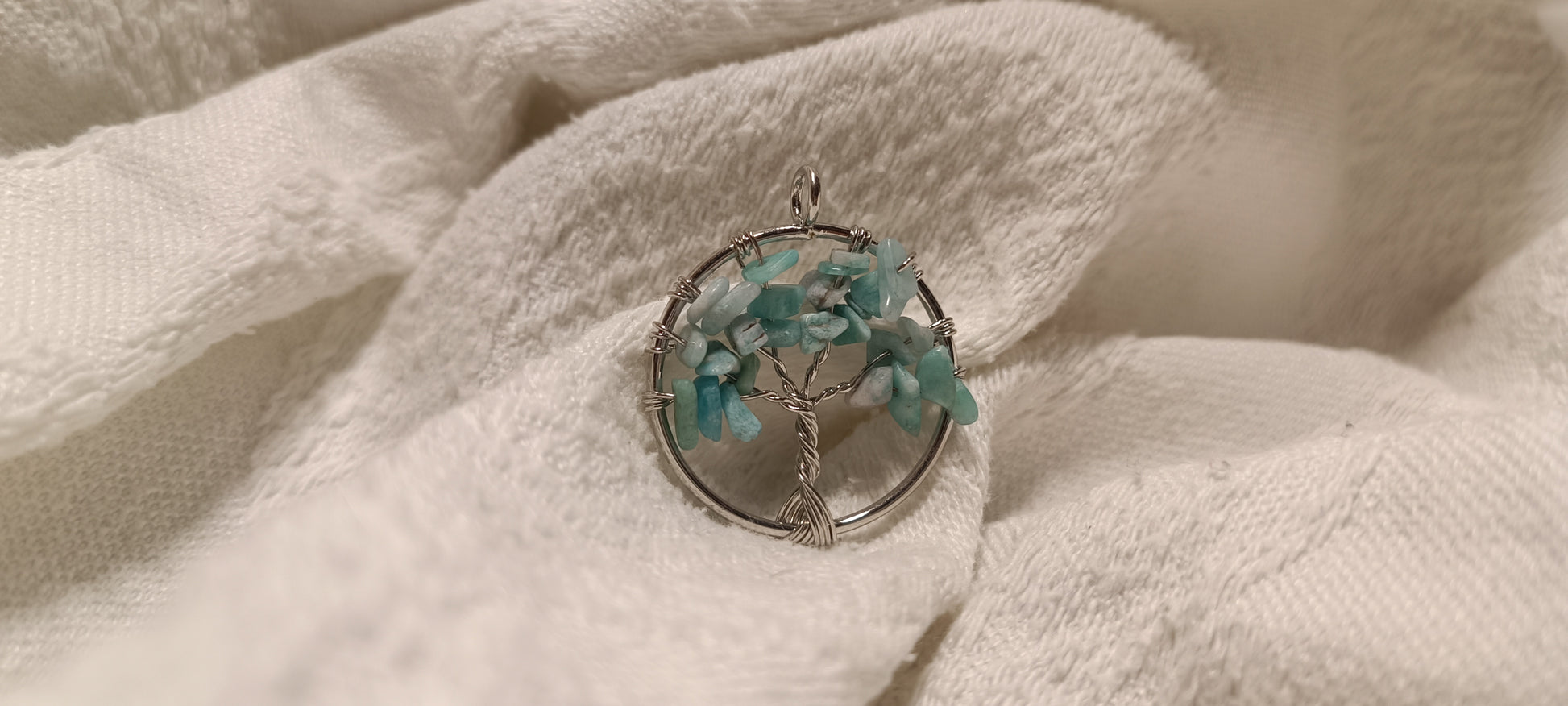 Colgante redondo de acero inoxidable, hecho a mano con técnica de alambrismo y piedras naturales tipo grava de Aguamarina.