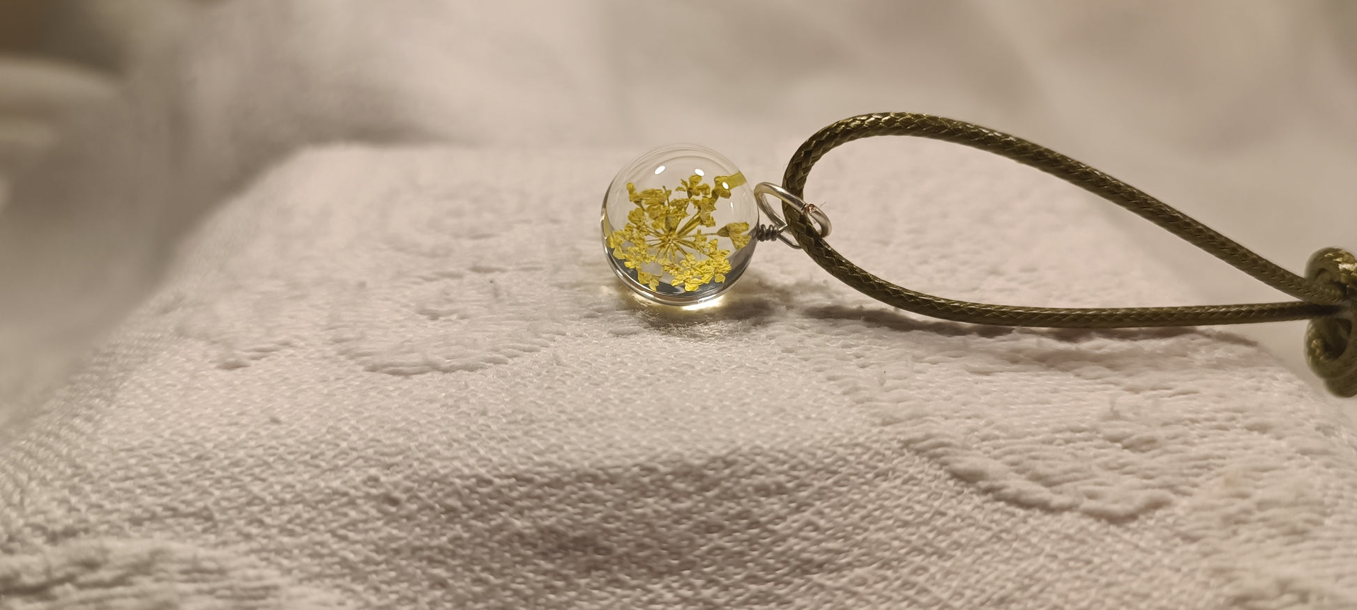 Colgante de resina con flores preservadas en forma de semiesfera.