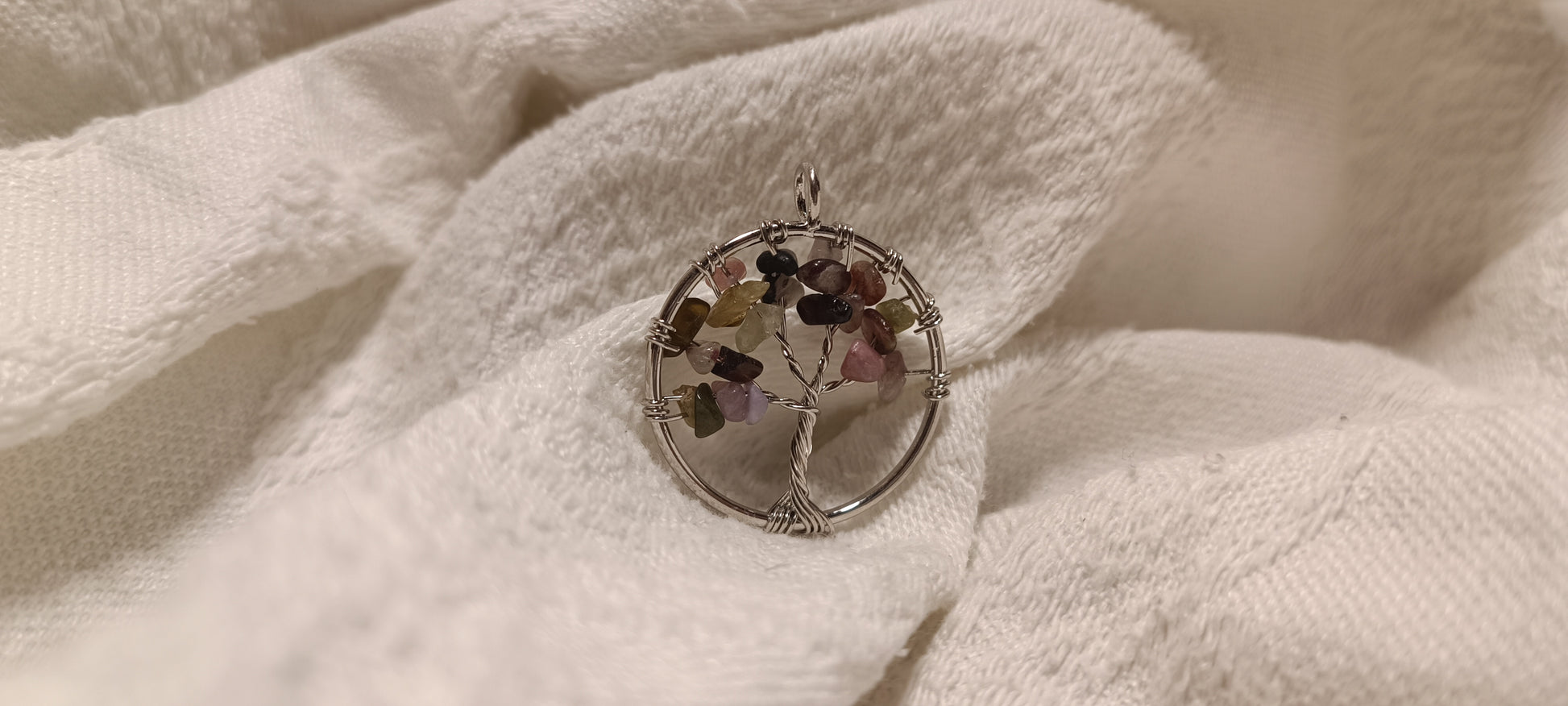 Colgante redondo de acero inoxidable, hecho a mano con técnica de alambrismo y piedras naturales tipo grava de Multi Ágatas.