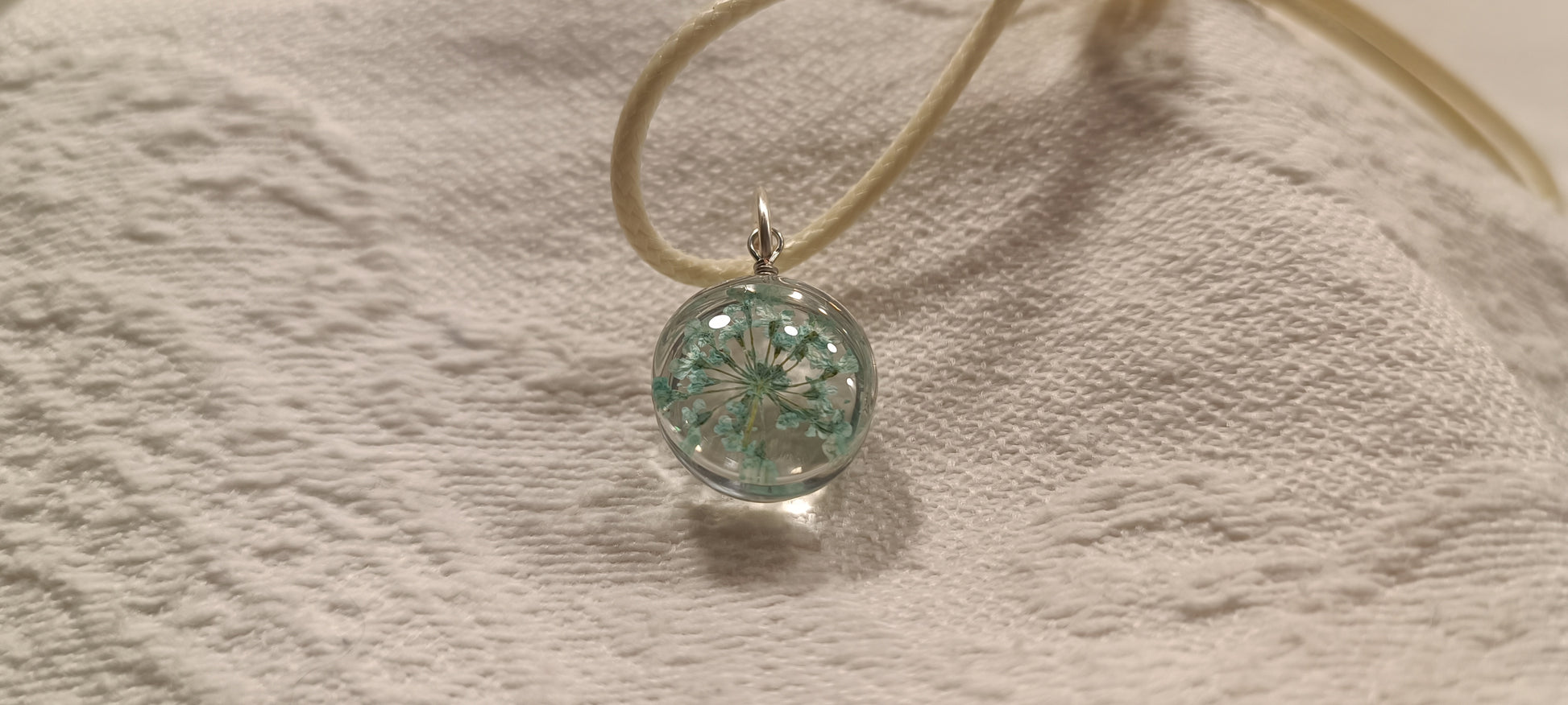 Colgante de resina con flores preservadas en forma de semiesfera.