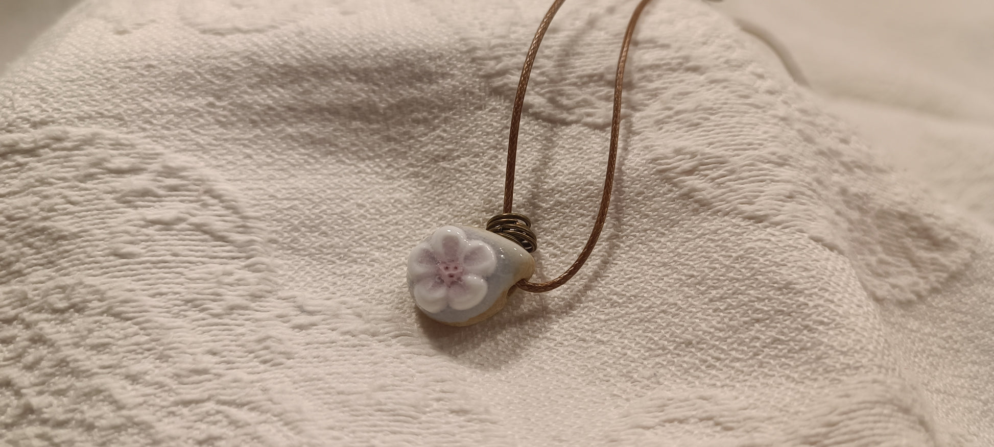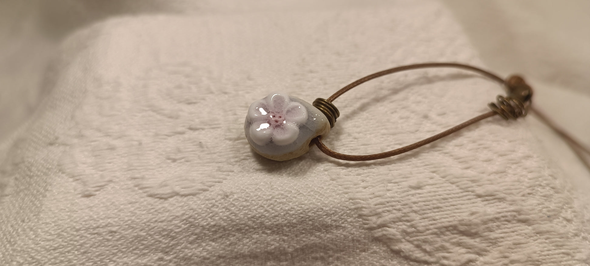 Colgante de cerámica étnica, con motivos florales pintado a mano. Contiene dos cascabeles.