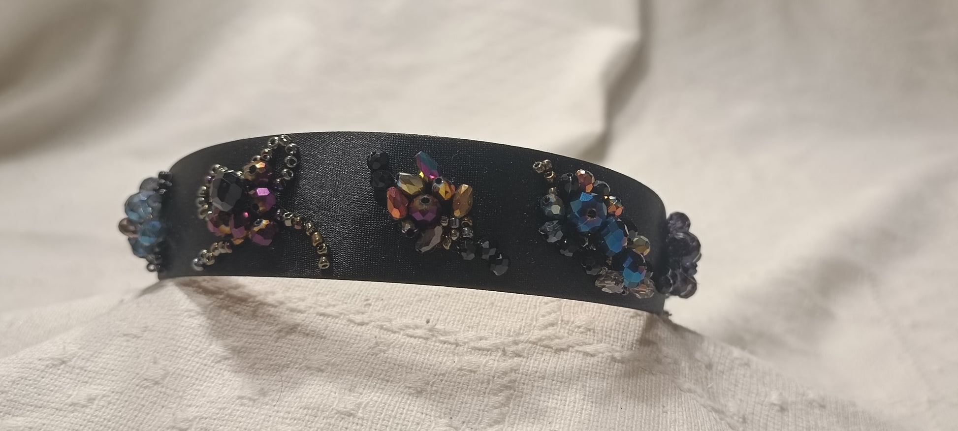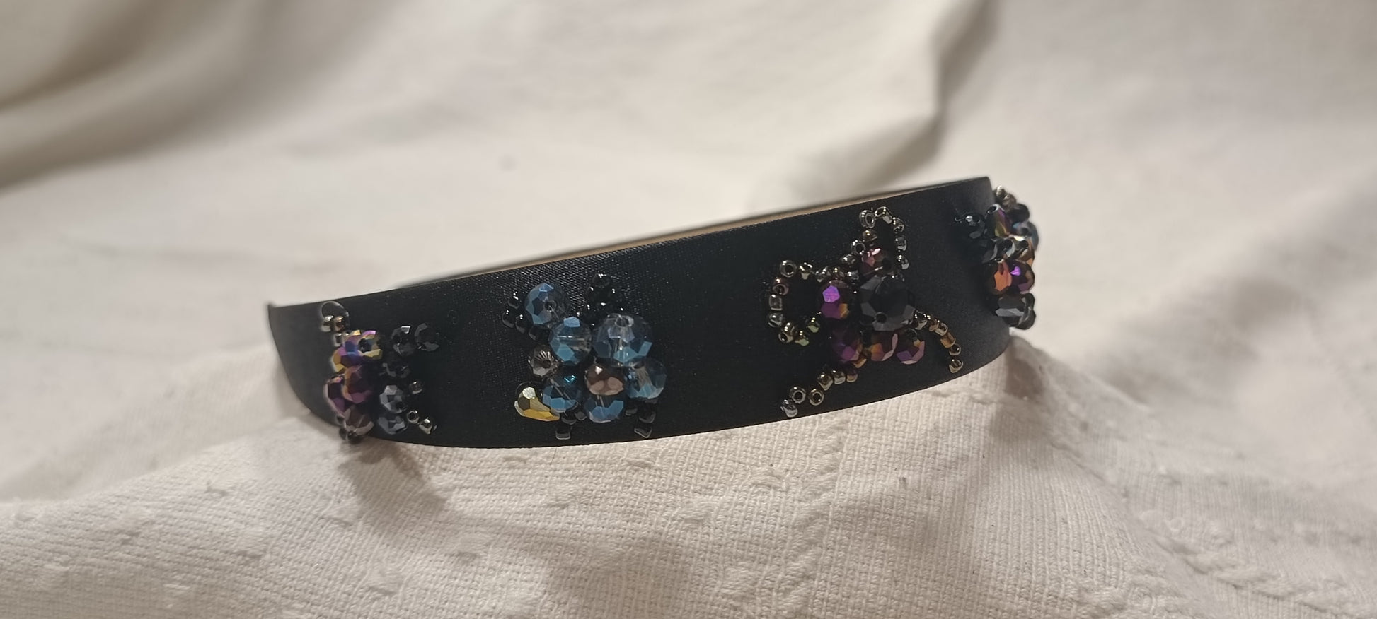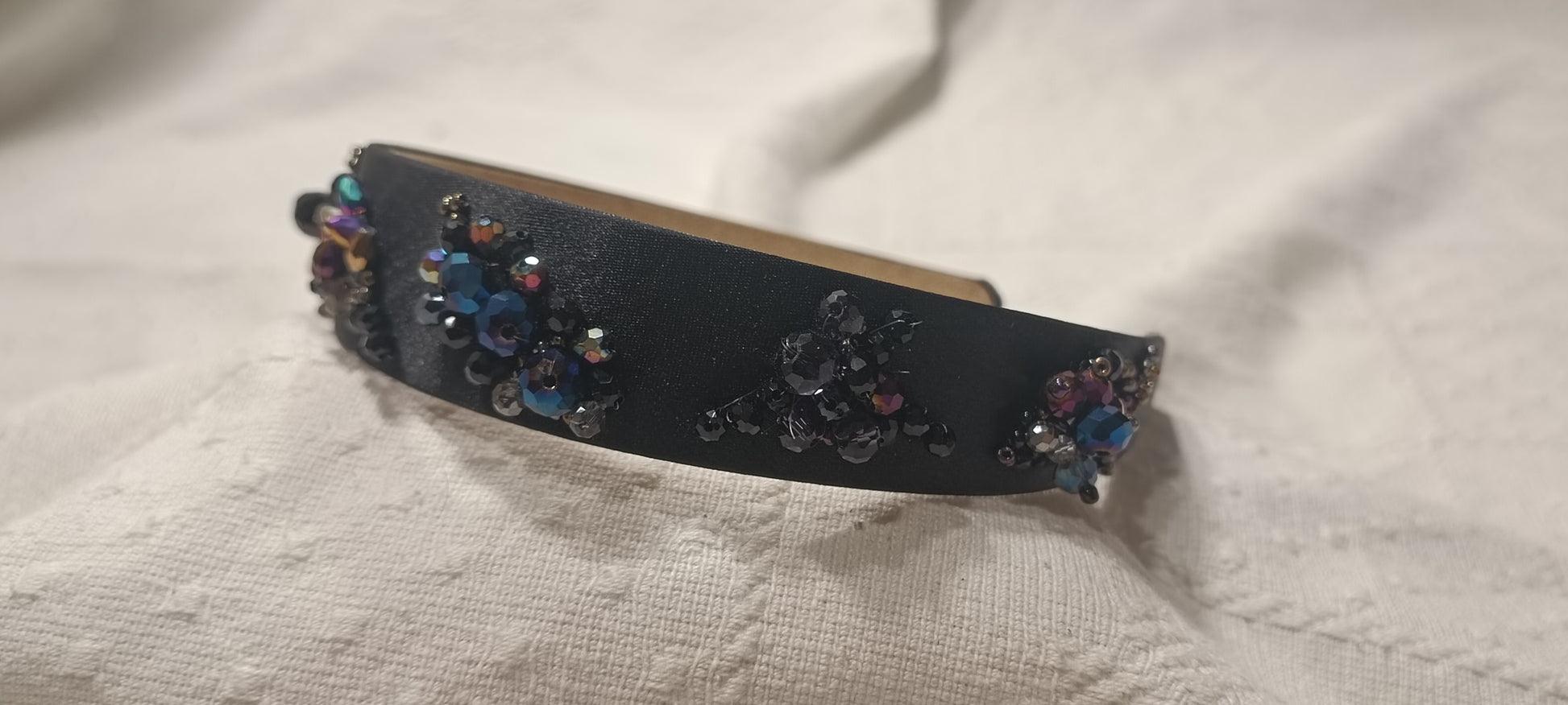 Diadema de tela de raso en color negro. Cosida con cristales facetados y de rocalla. Hecha a mano.