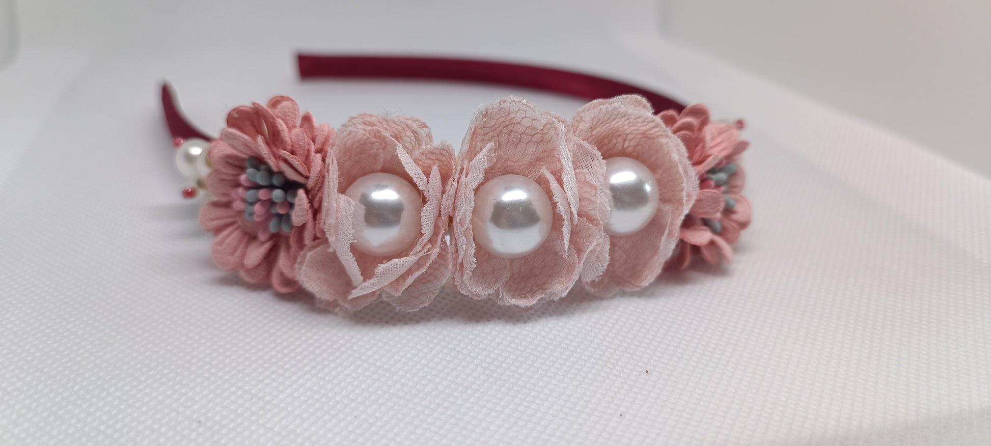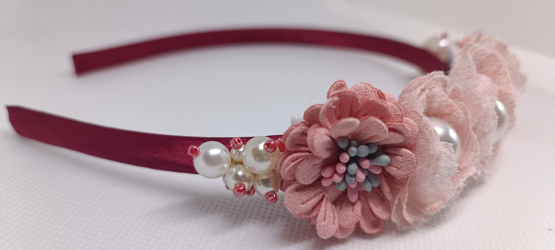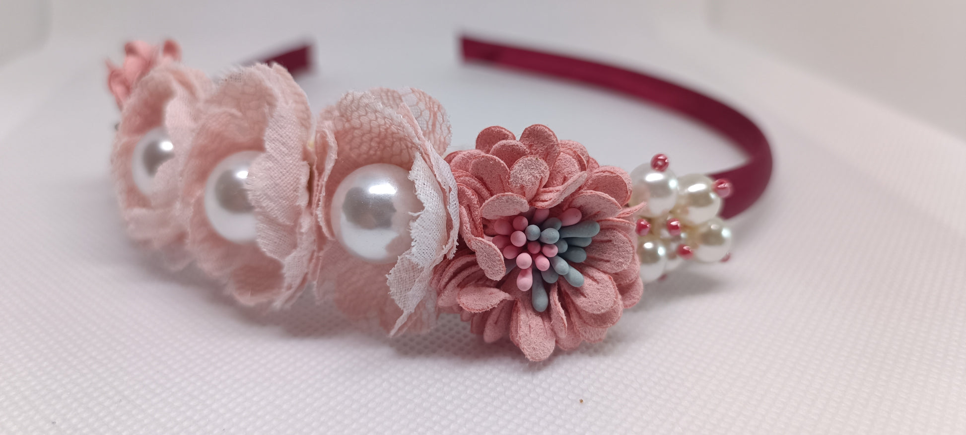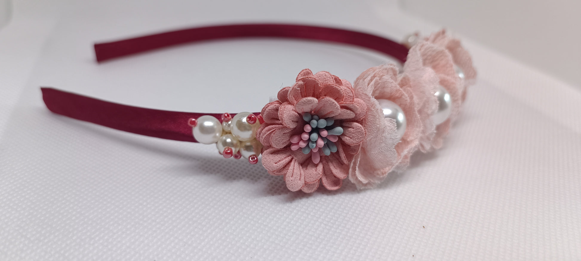Diadema de tela de raso burdeos. Elaborada con flores de tela en tonos beige y rosa y perlas a juego.