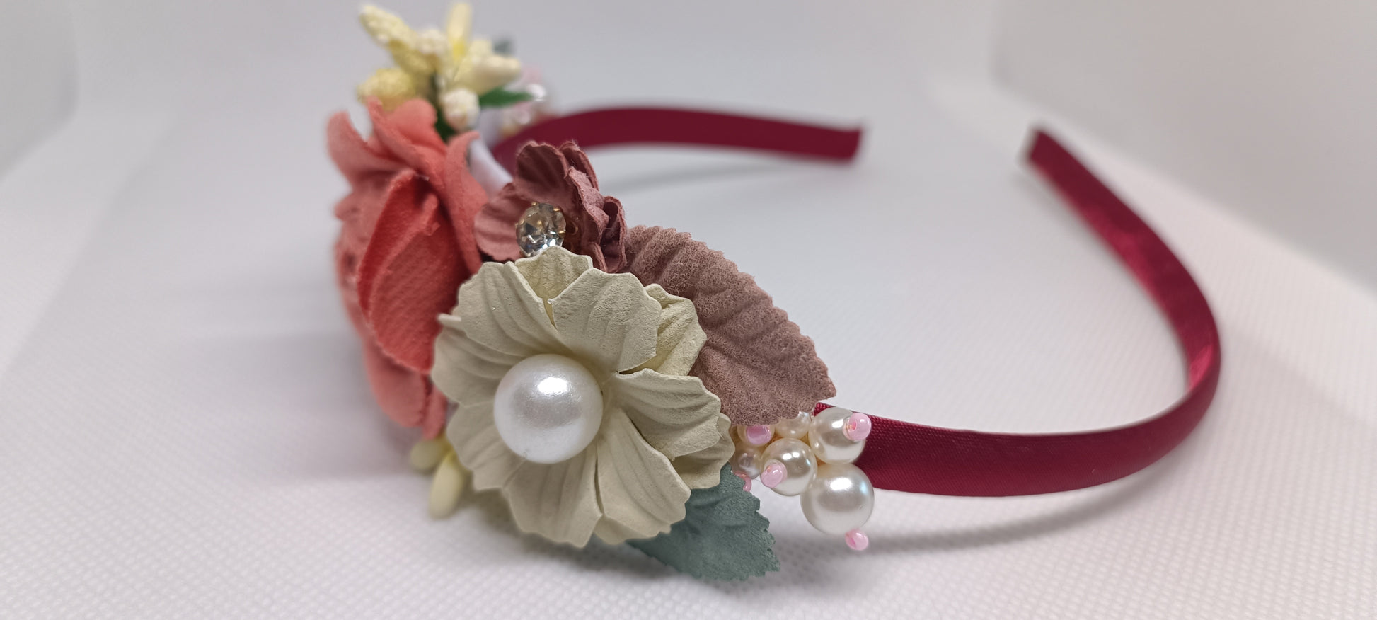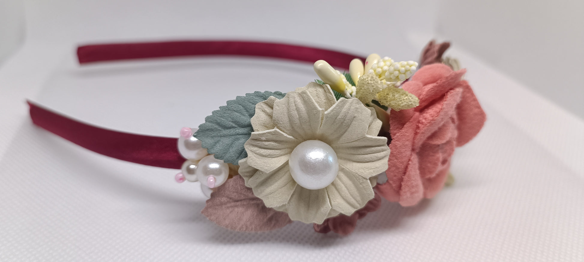 Diadema de tela de raso burdeos. Elaborada con flores de tela en tonos beige y rosa y perlas a juego.