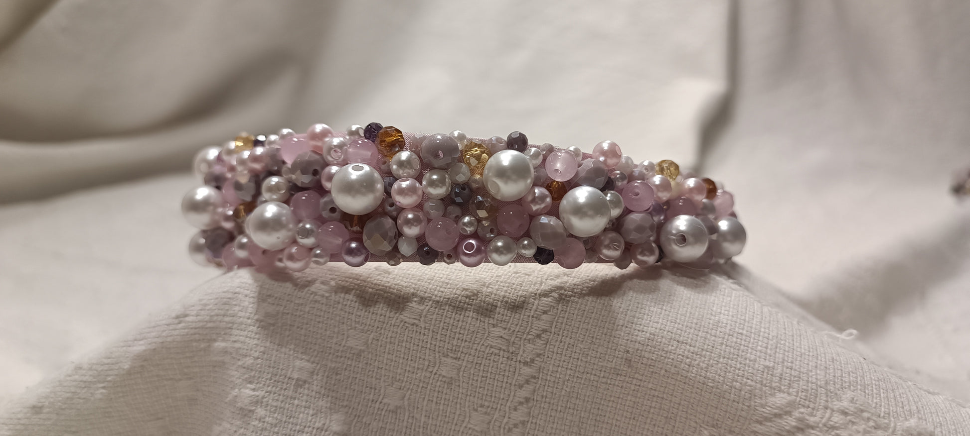 Diadema de raso rosa. Cosida con cristales facetados, de rocalla y perlas blancas. Hecho a mano.