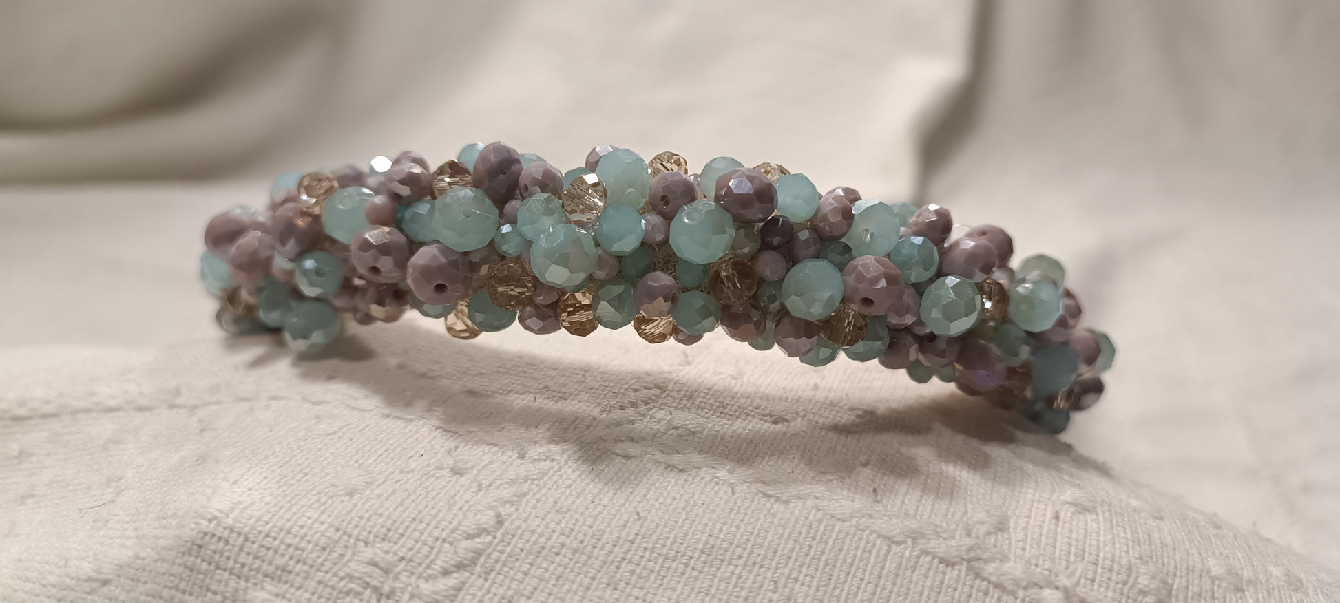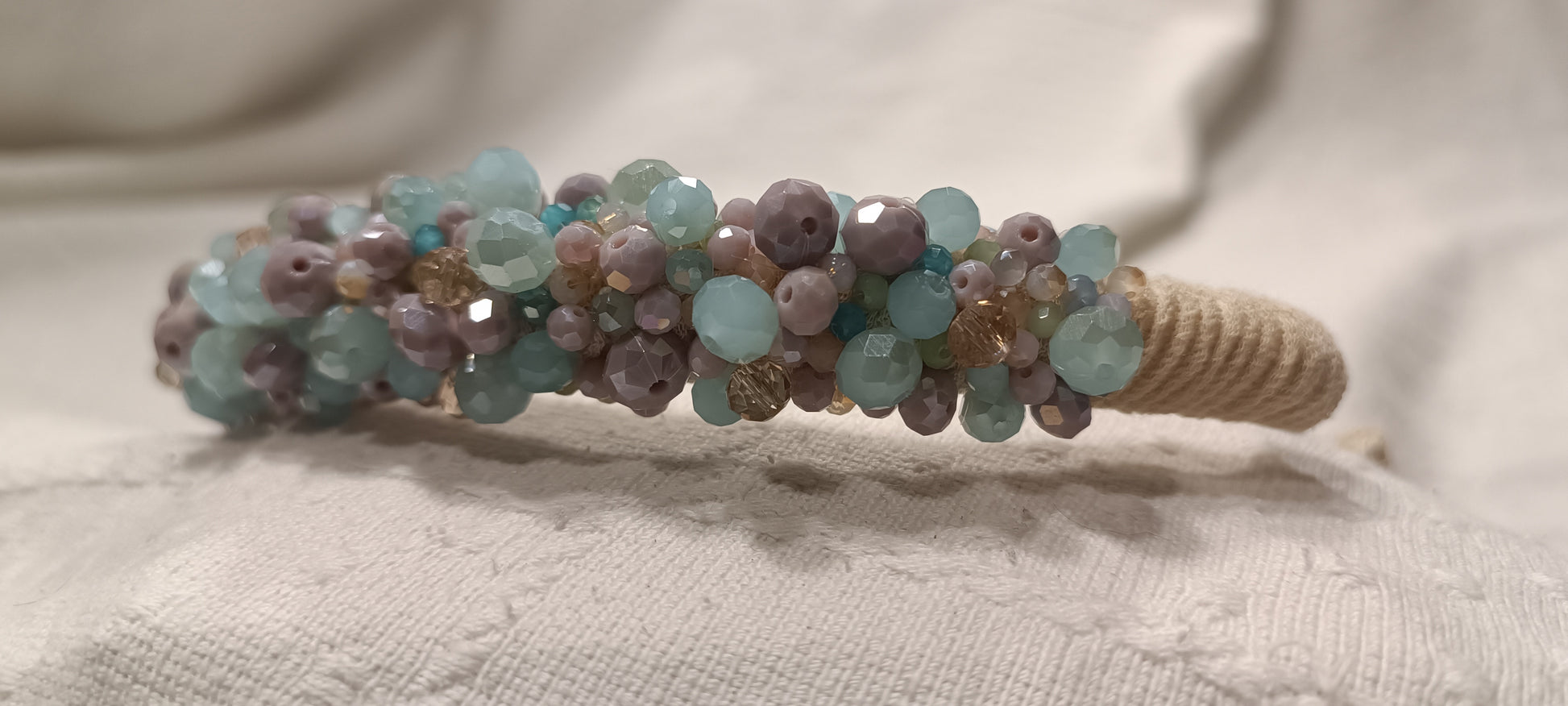 Diadema acolchada color nude. Cosida con cristales facetados y de rocalla. Hecha a mano