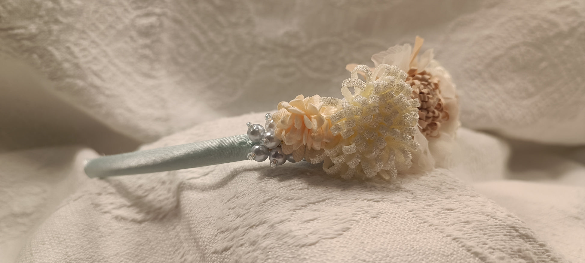 Diadema de tela de raso azul. Elaborada con flores de tela en tonos beige y perlas a juego.