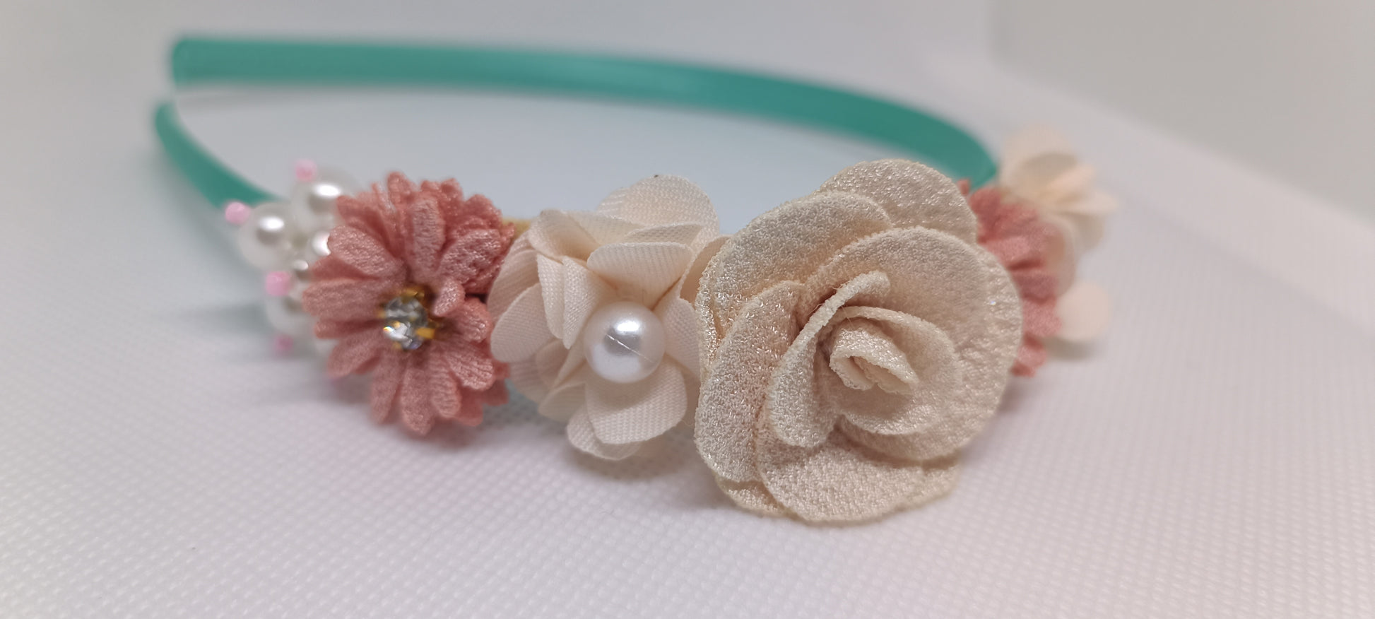 Diadema de tela de raso verde. Elaborada con flores de tela en tonos beige y perlas a juego.
