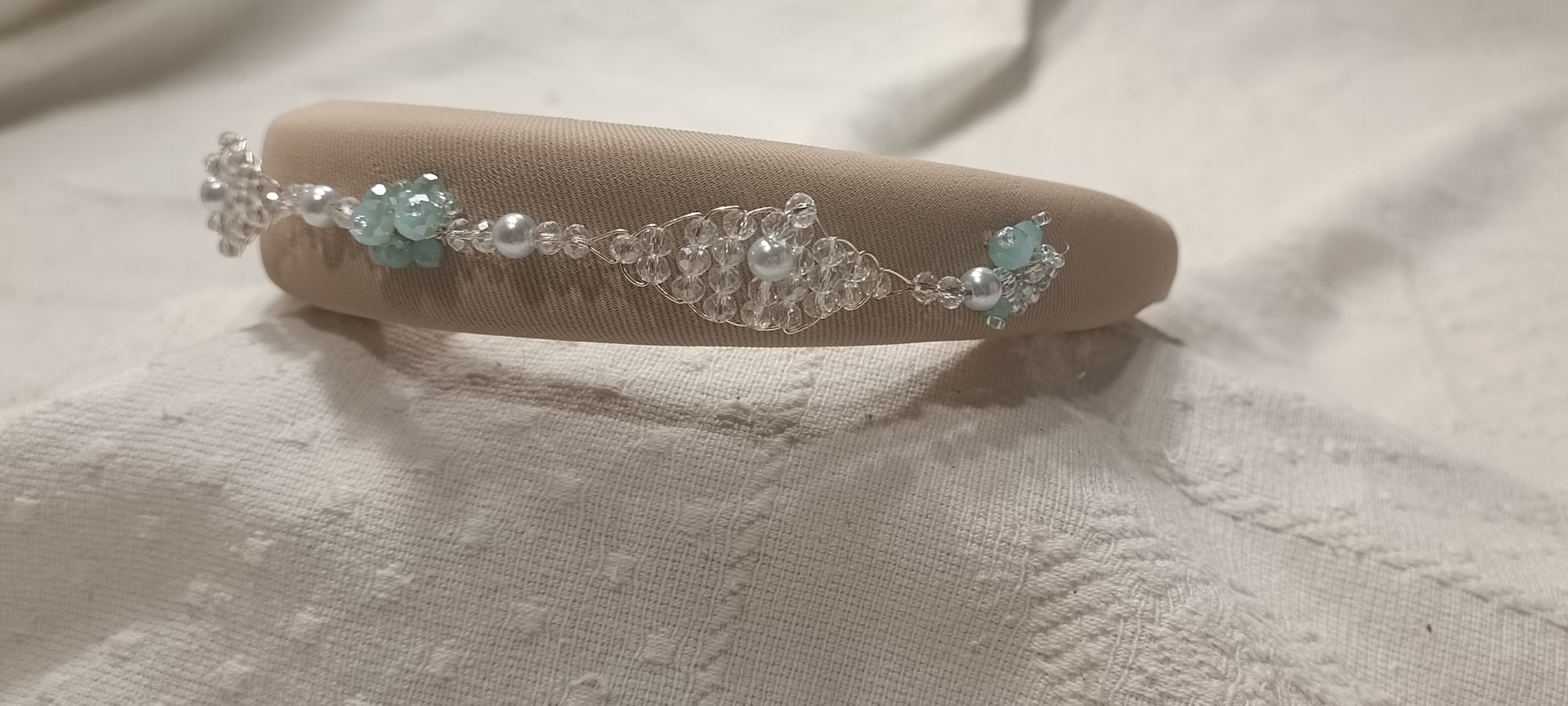 Diadema de tela acolchada en color nude. Cosida con cristales facetados y de rocalla. Hecha a mano