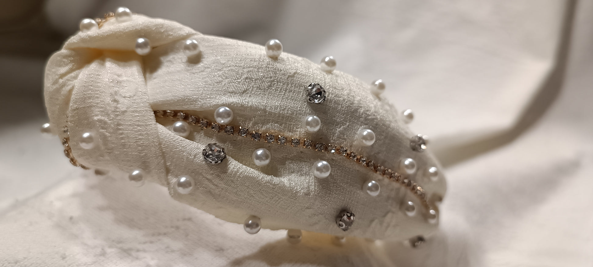 Diadema de tela de color blanco. Remachada con cristales de strass y perlas. Hecha a mano