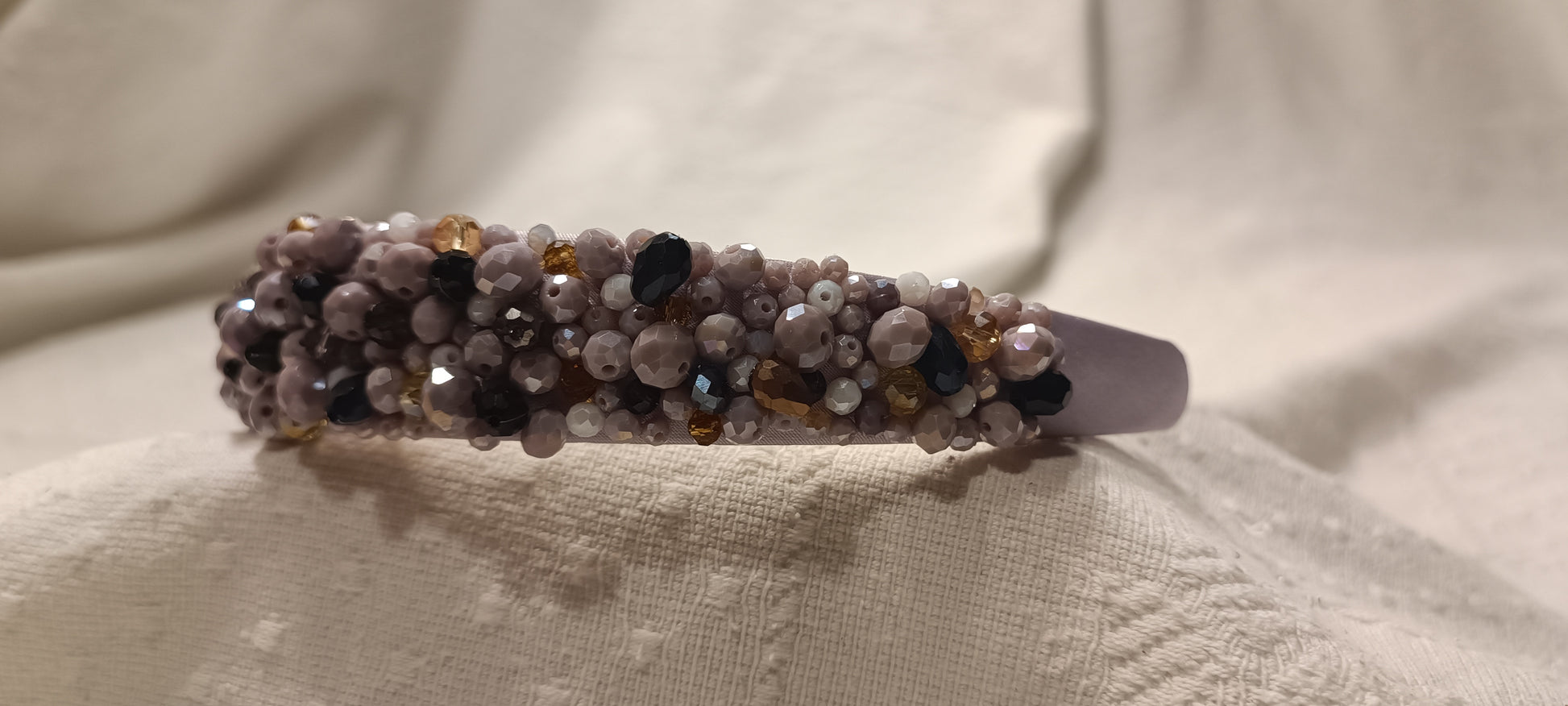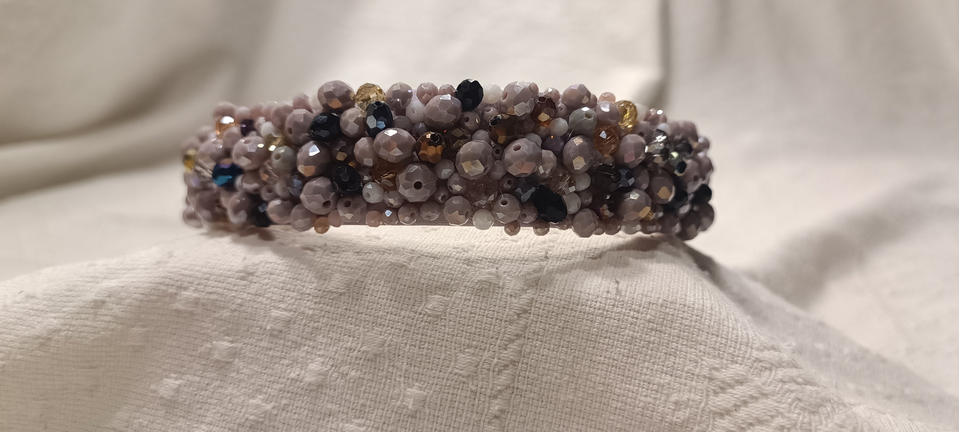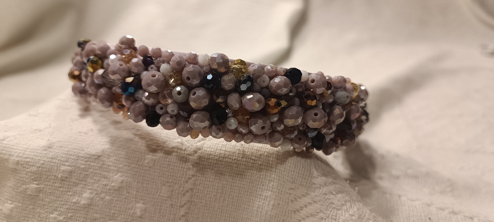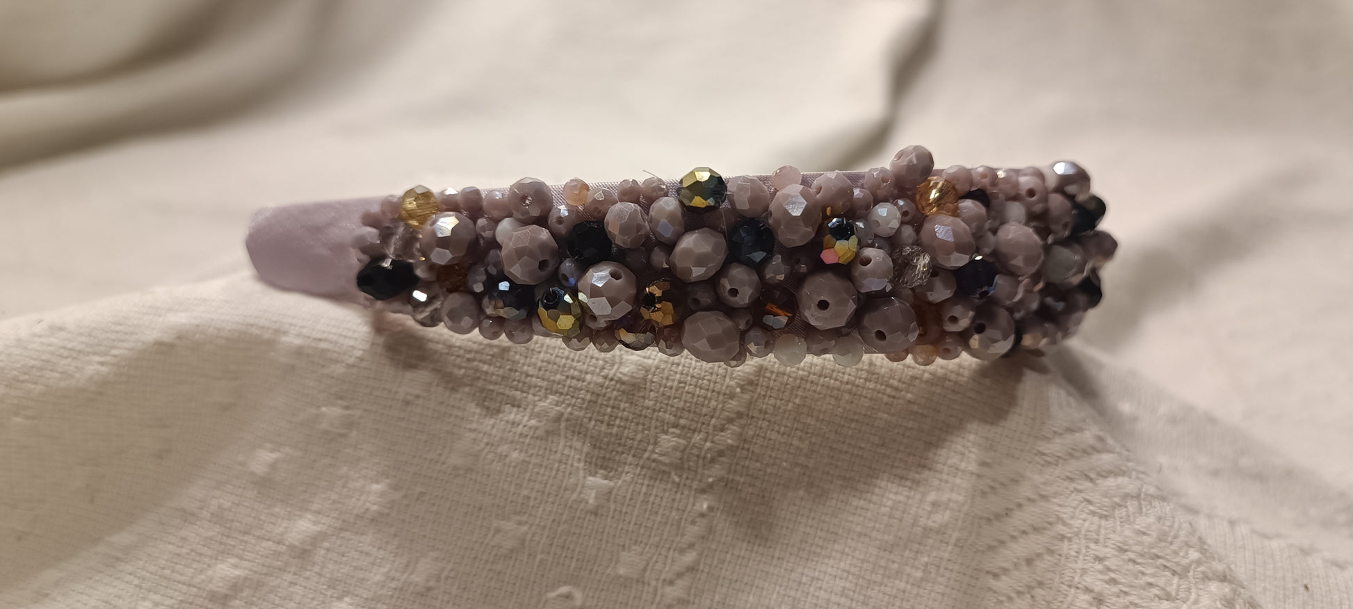 Diadema de raso malva. Cosida con cristales facetados y de rocalla. Hecho a mano