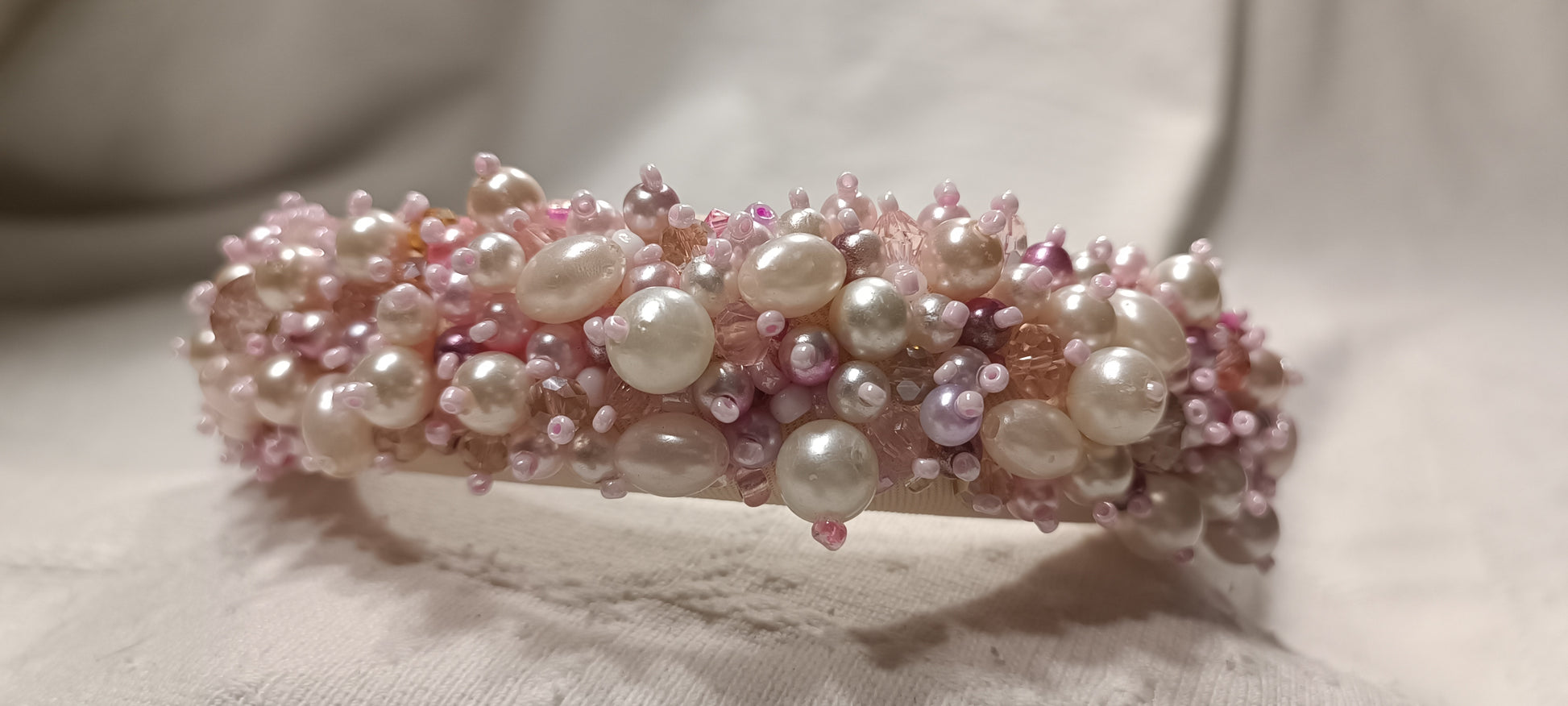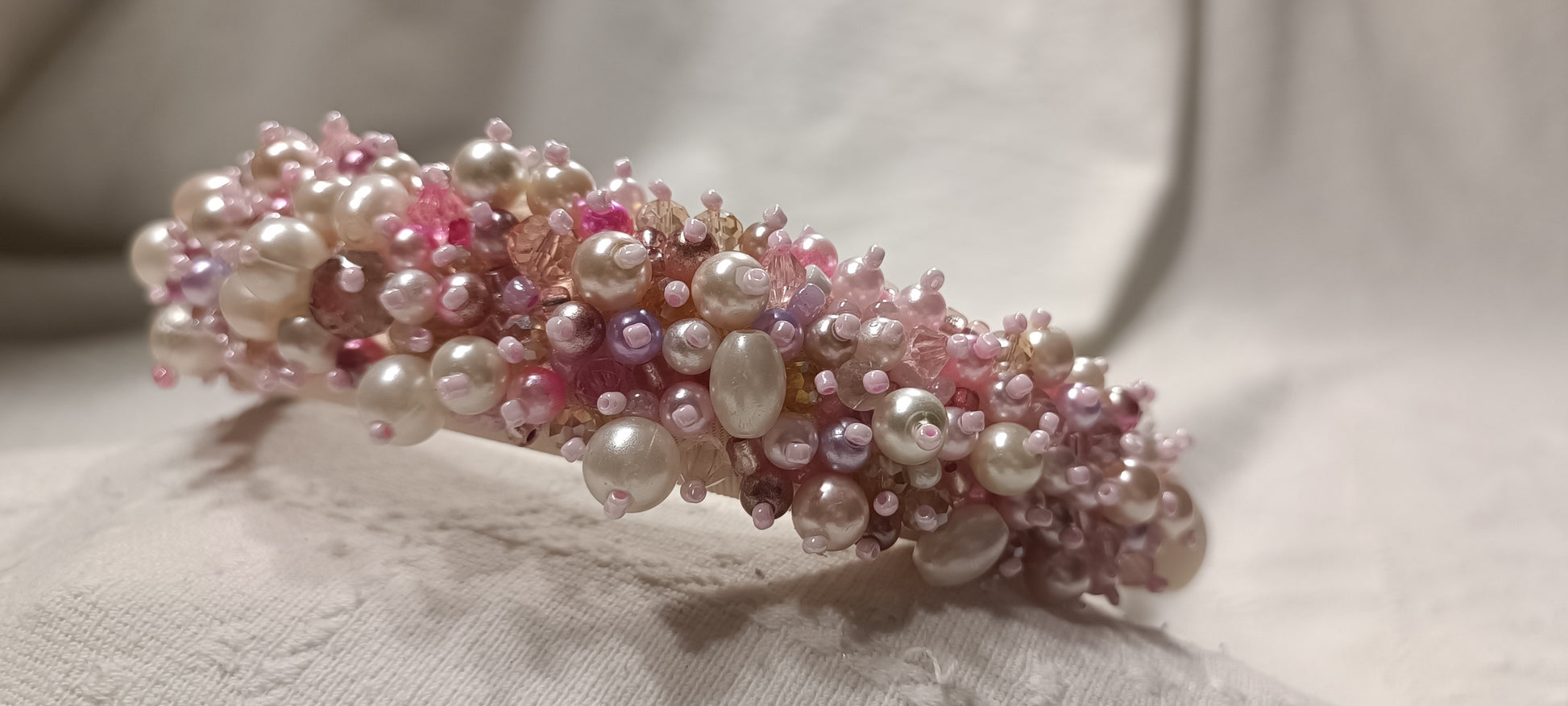 Diadema de tela acolchada color nude. Cosida con cristales facetados, de rocalla y perlas blancas. Hecha a mano.