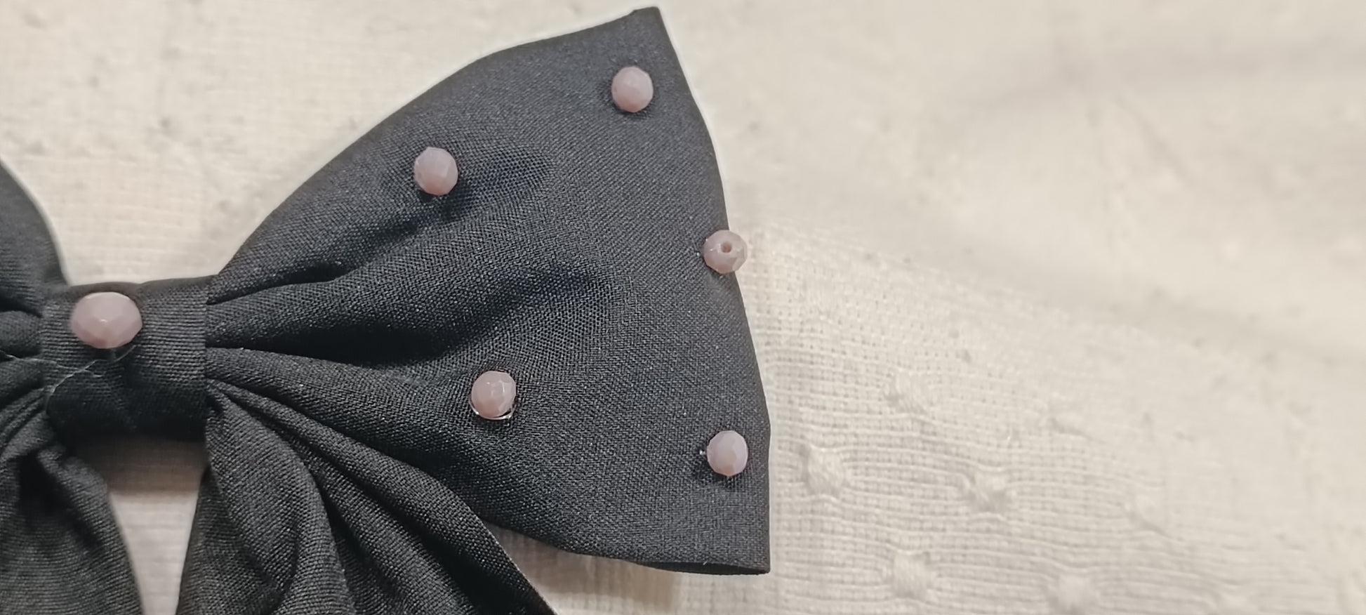 Lazo de tela negra con cuentas de cristal facetado en colores malvas.