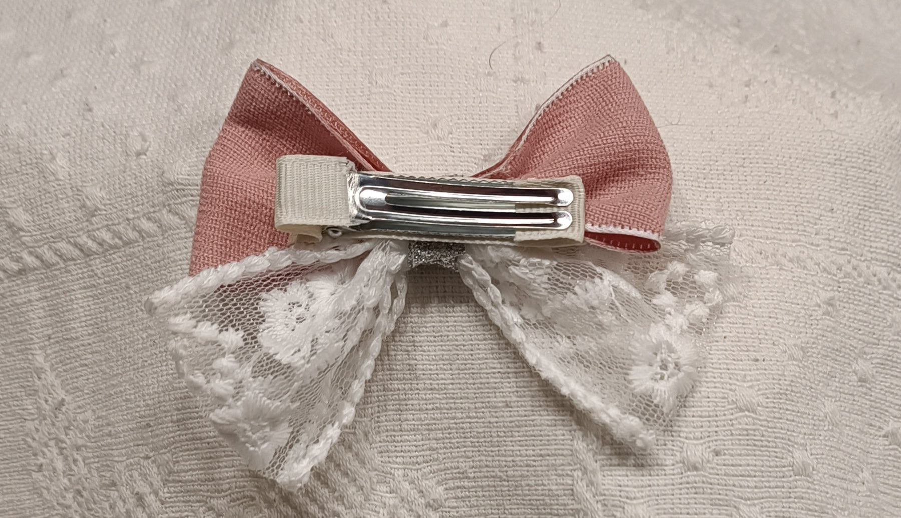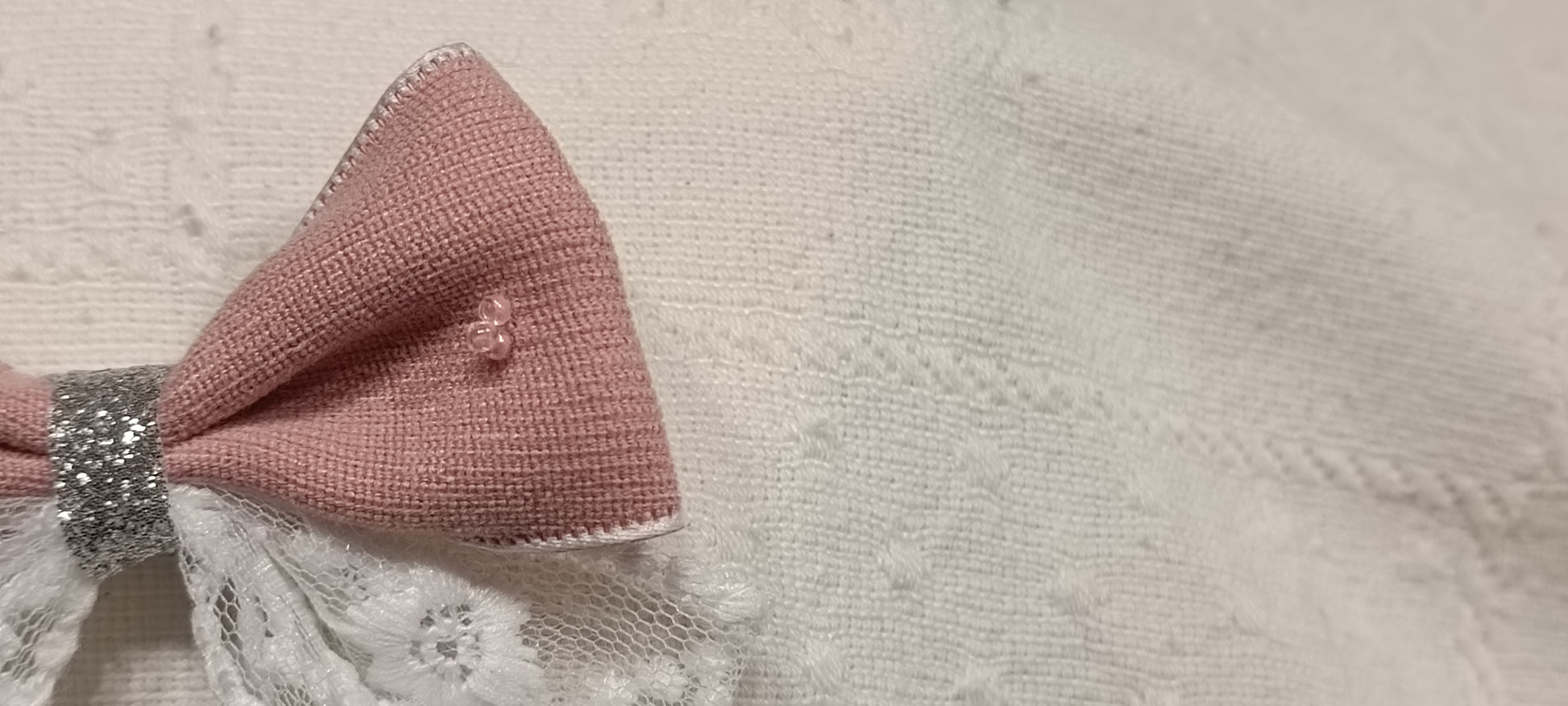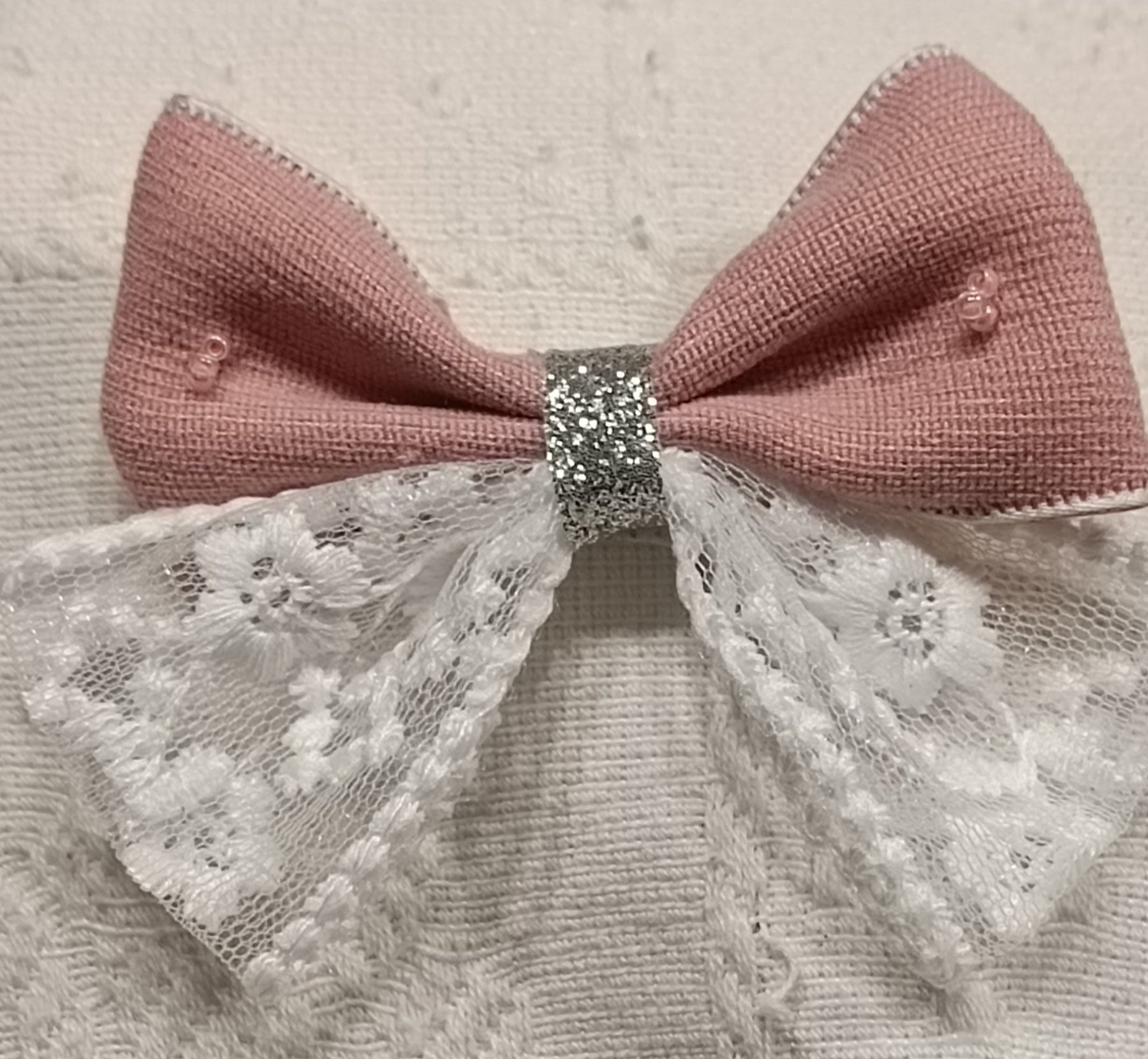 Lazo de tela rosa con puntilla blanca. Cosido con cristales facetados en tonos rosas.