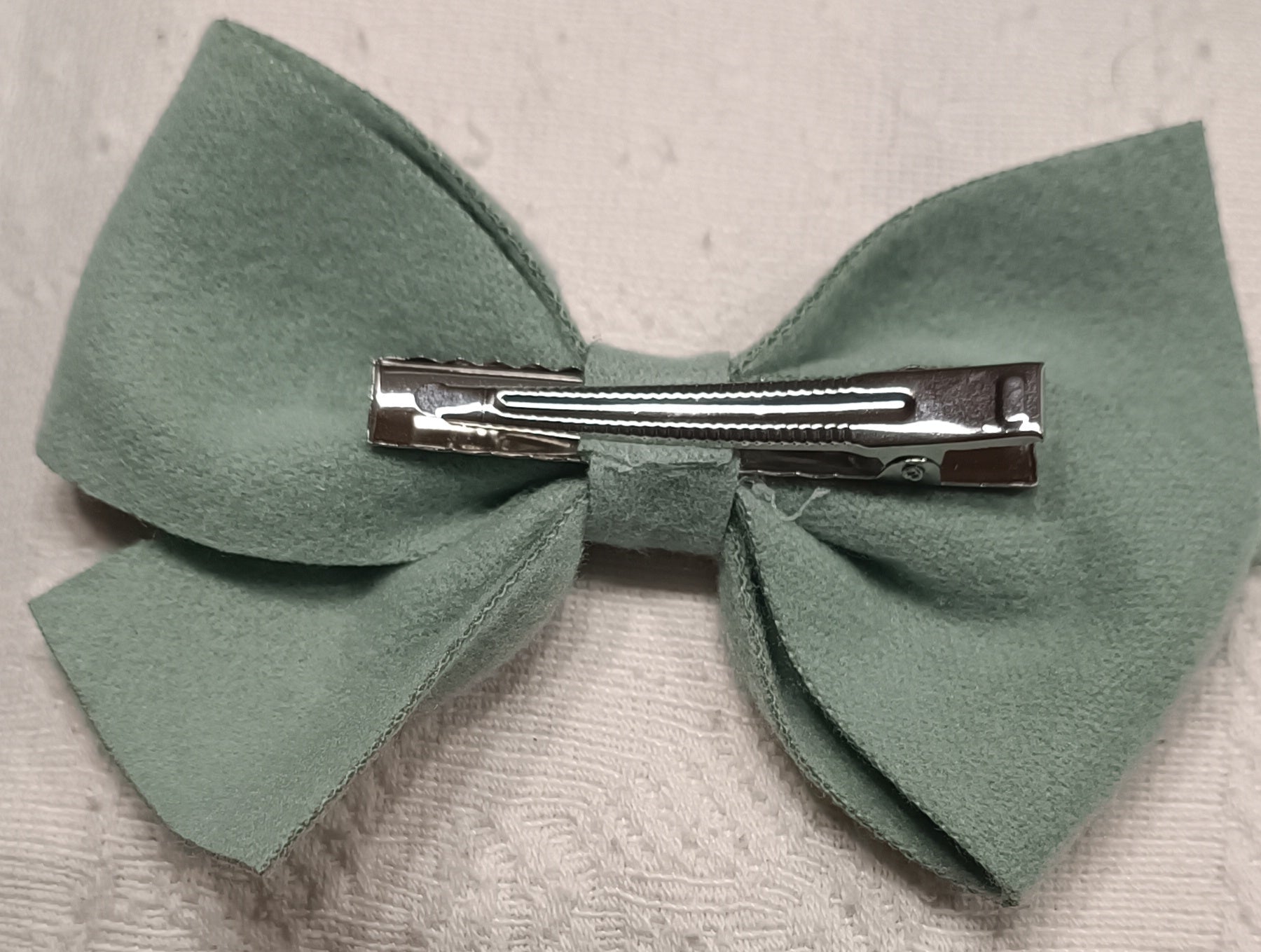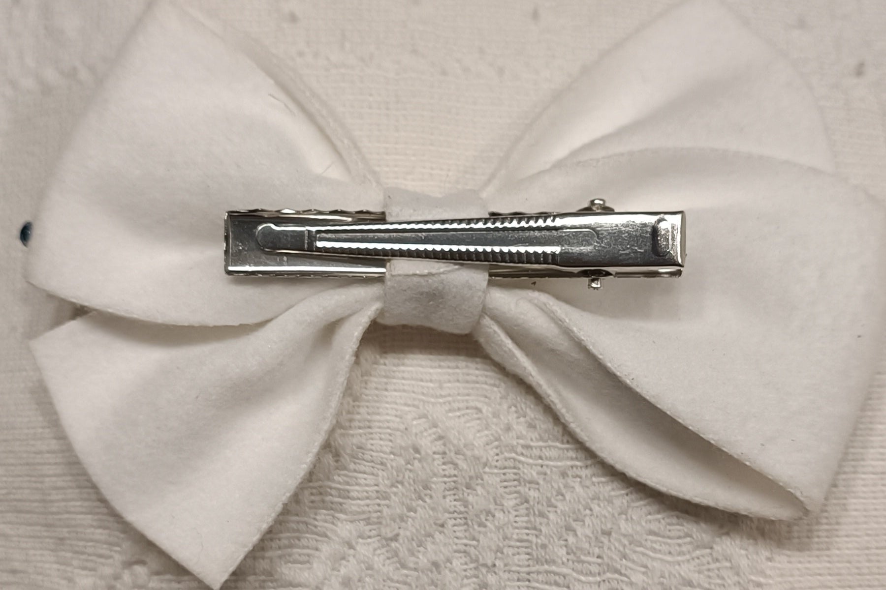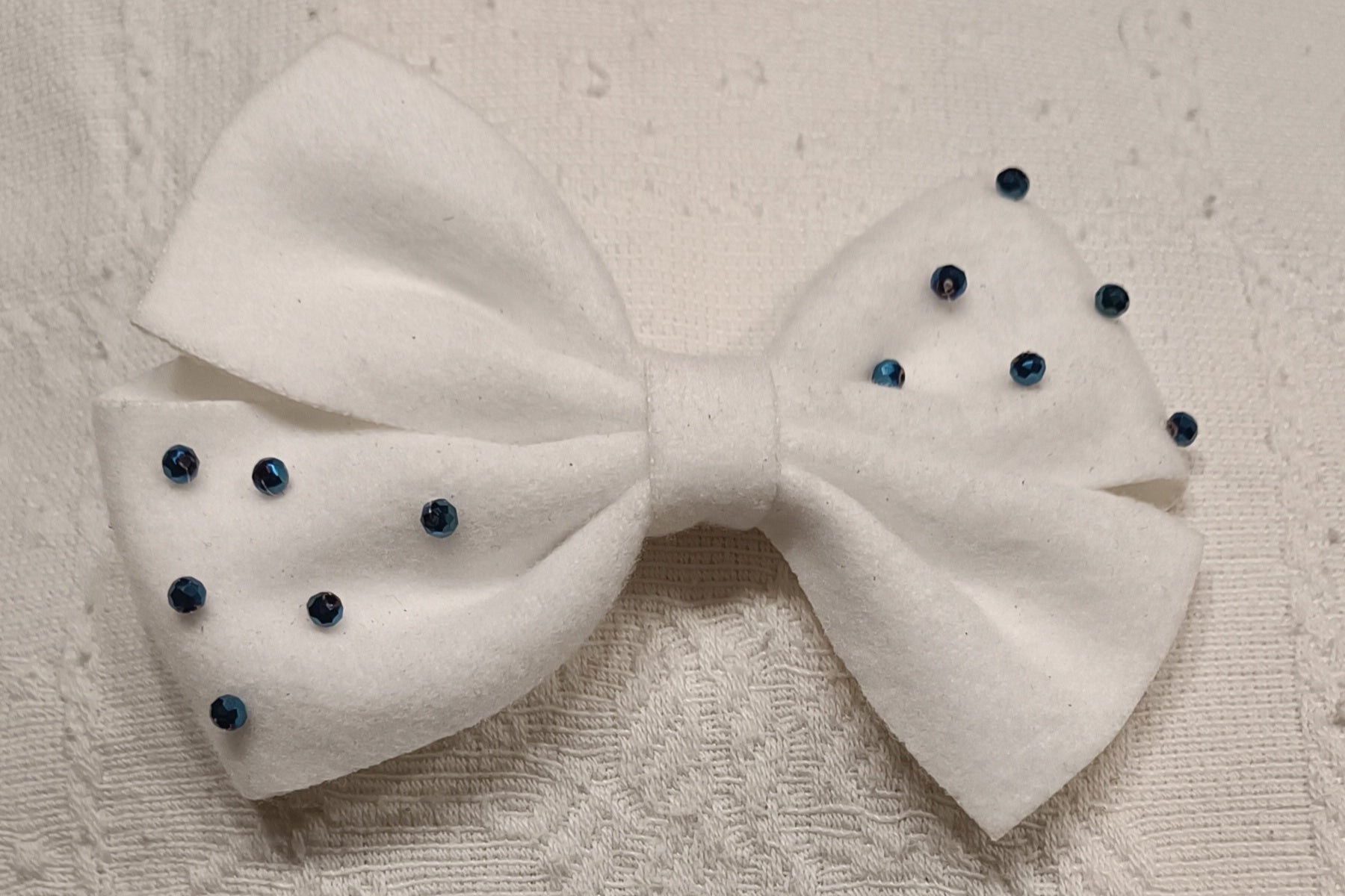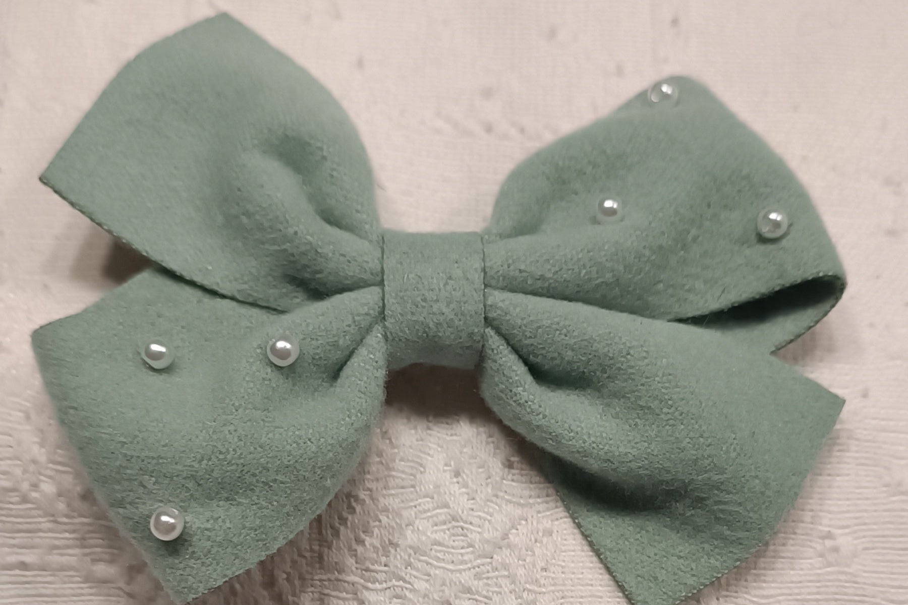 Lazos de paño en colores blanco y verde. Con cuentas de cristal cosidas.
