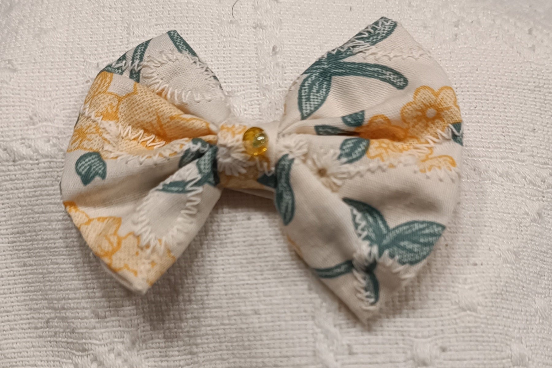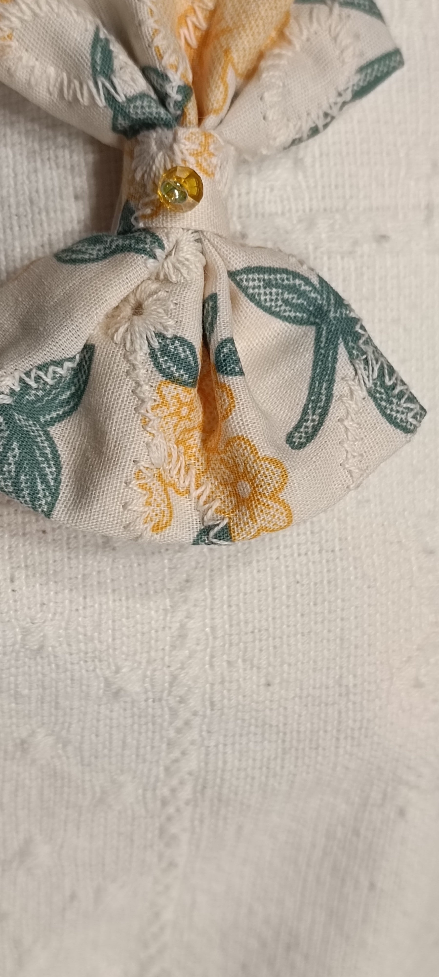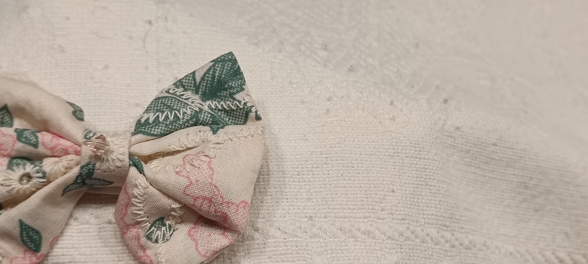 Lazos de tela con flor bordada y cristal facetado cosido en el centro.