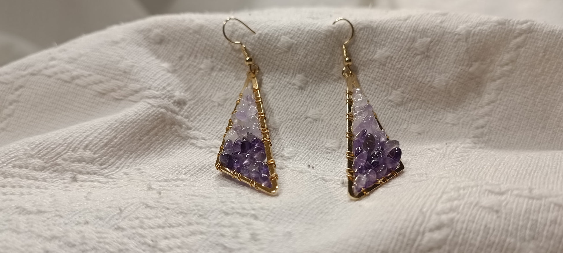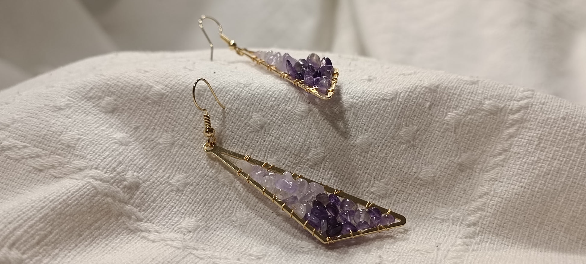 Pendientes elaborados con alambre de acero inoxidable con baño dorado y piedras naturales de amatista de tipo grava.