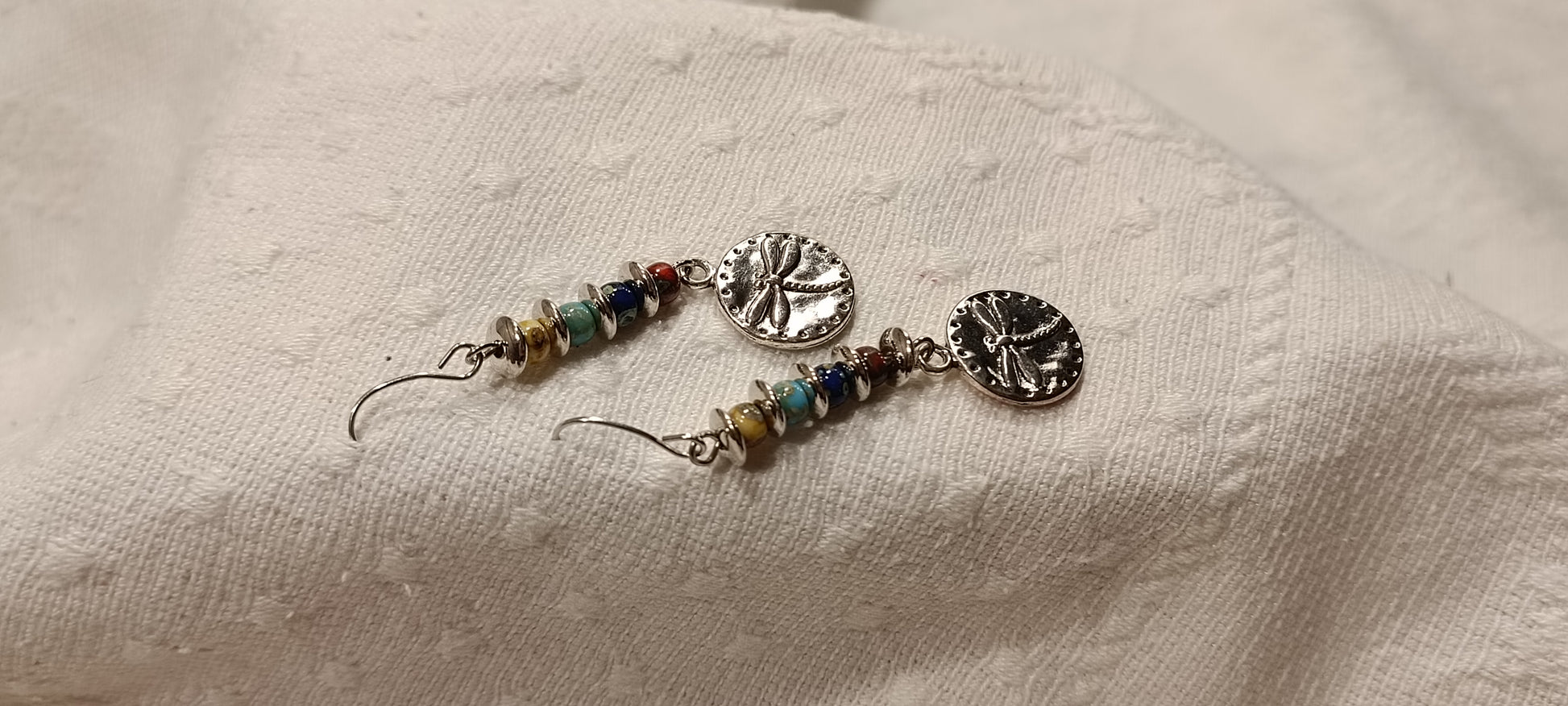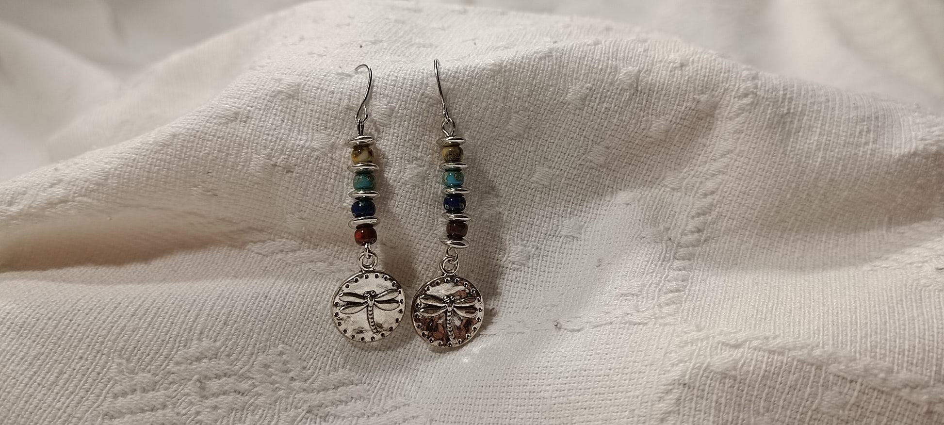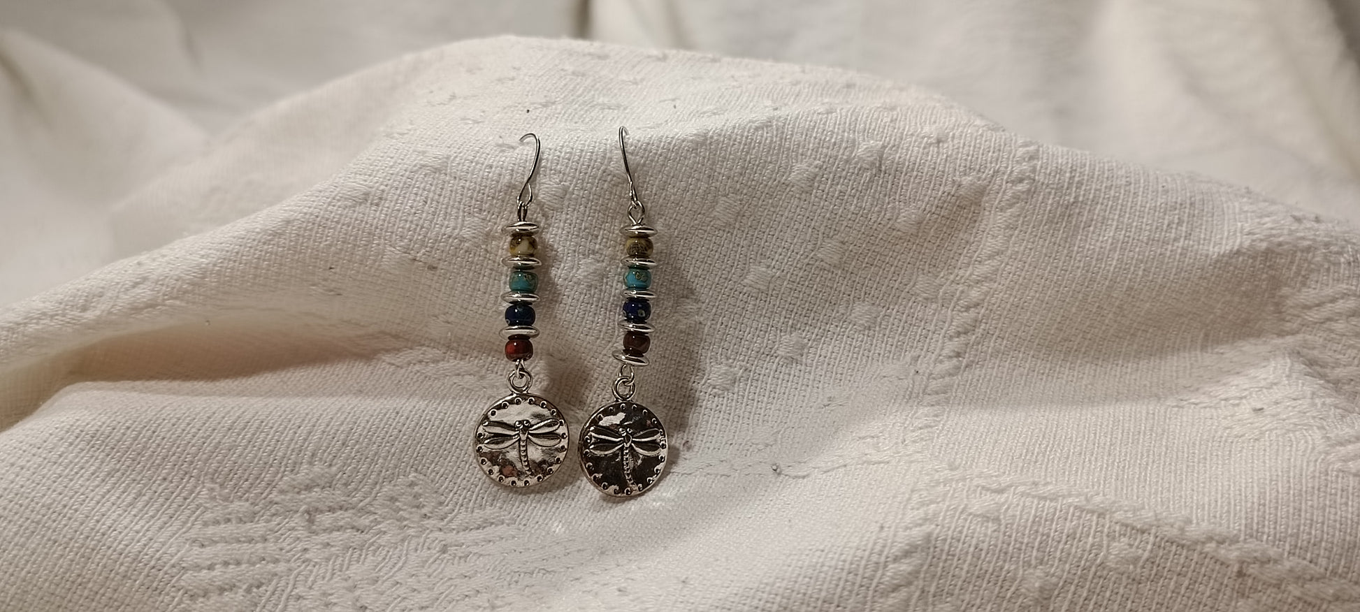 Pendientes alargados, elaborados con acero inoxidable, cuentas de cristal imitando a piedras naturales y cuentas metálicas.