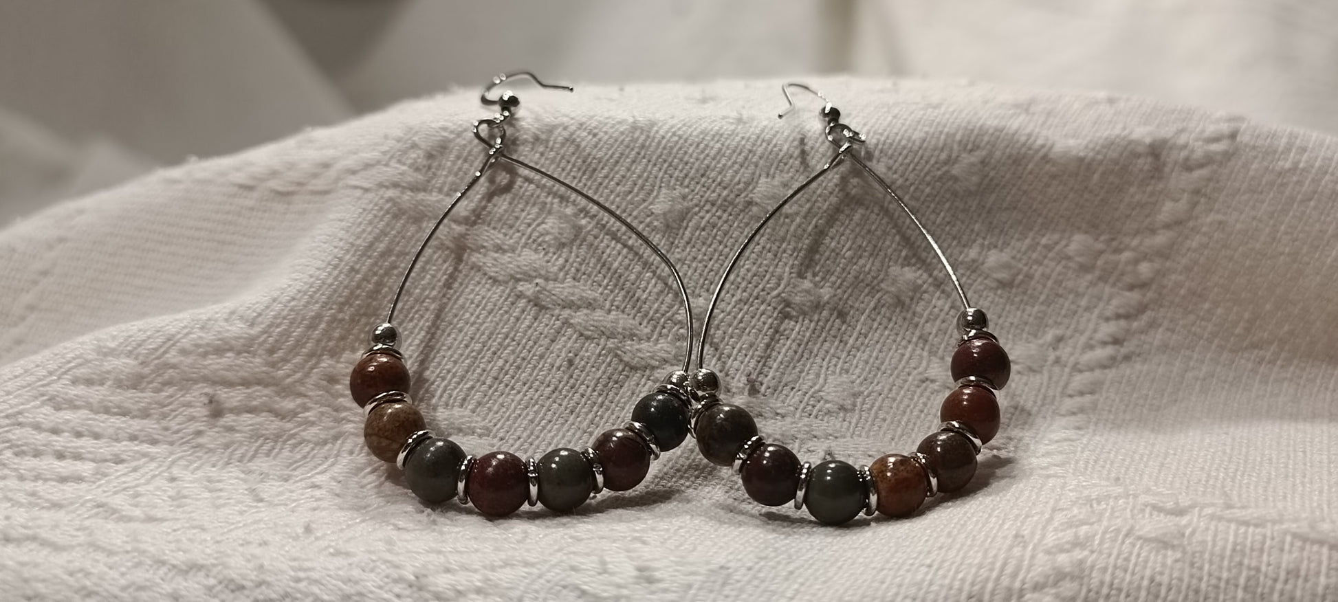 Pendientes alargados en forma de gota, elaborados con alambre de acero inoxidable en tono bronce, cuentas de cristal facetado y de metal.
