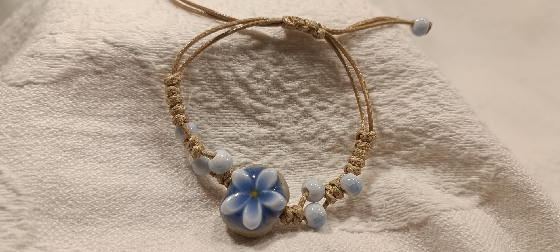 Pulsera de cerámica étnica, con motivos florales pintado a mano. Tejida con hilo encerado marrón y cuentas de cerámica a juego.