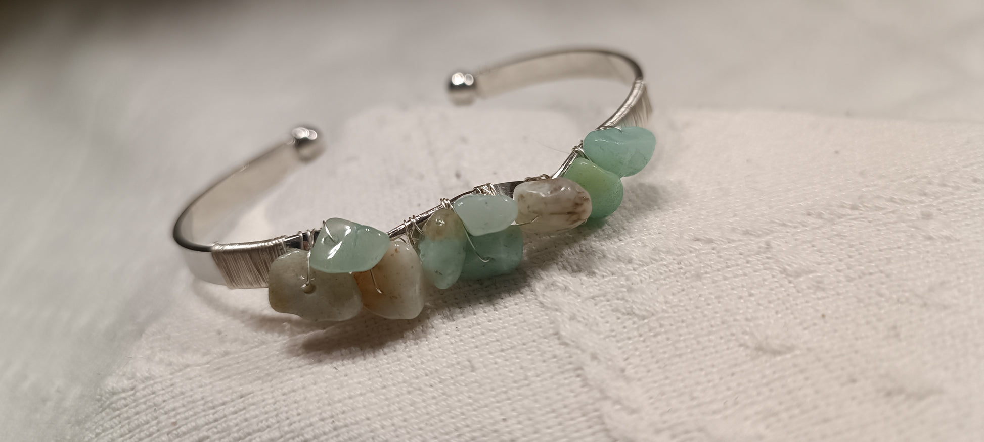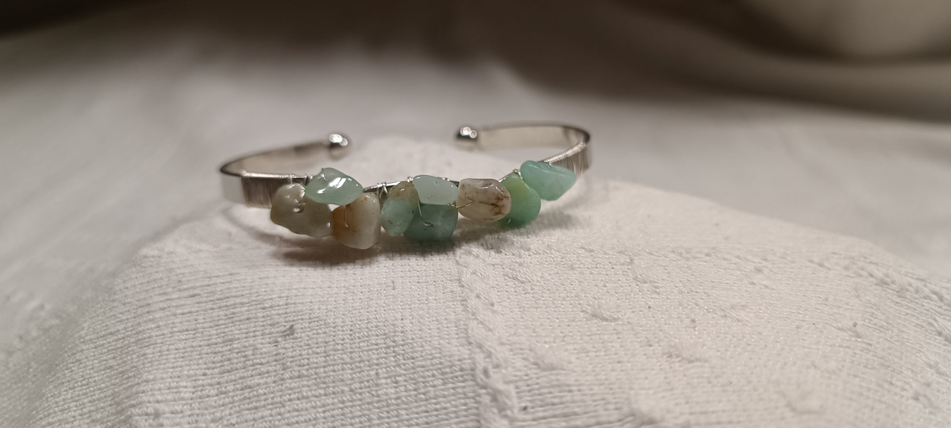 Pulsera-Brazalete ajustable de acero inoxidable. Compuesta por aguamarina en grava. Engarzado con técnica de alambrismo.