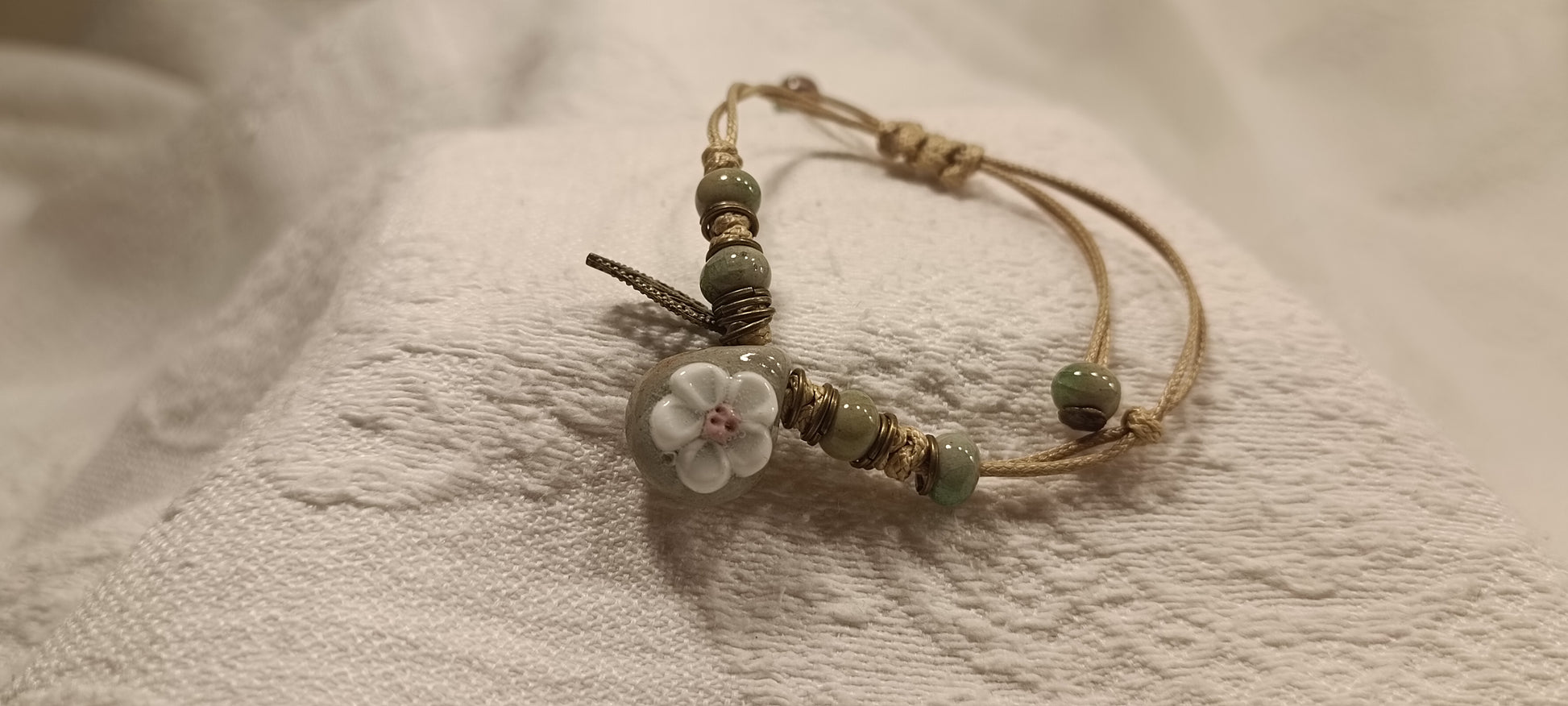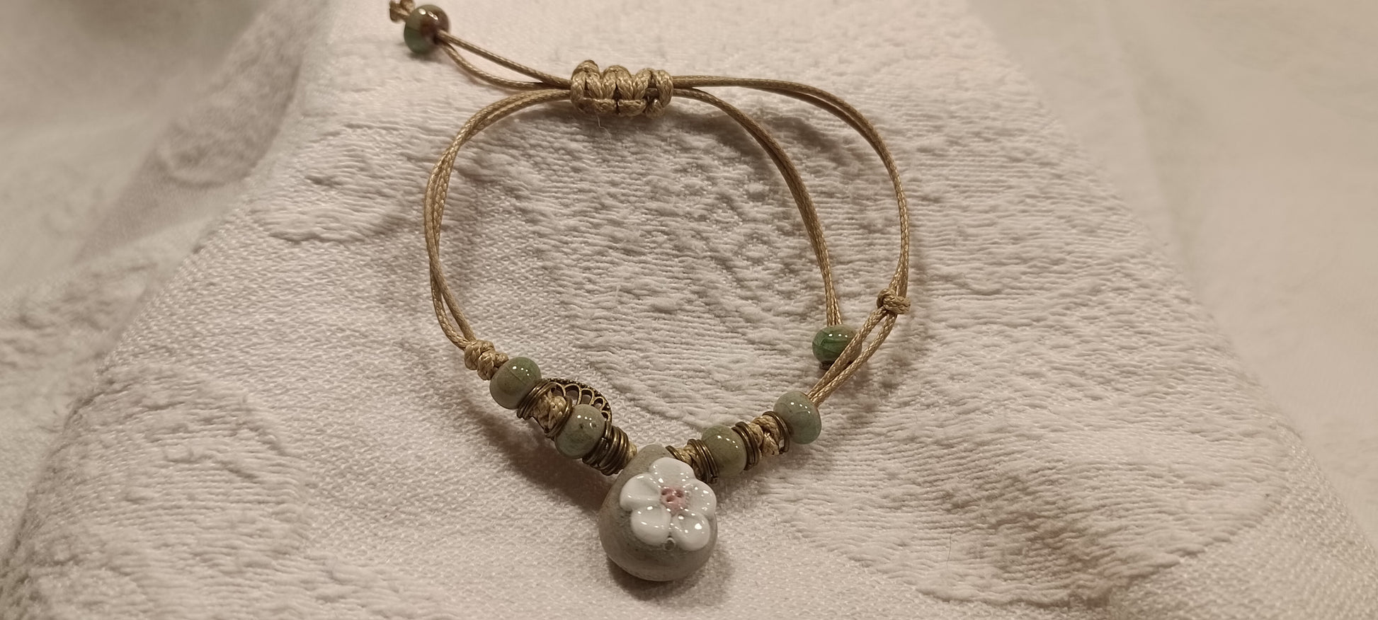 Pulsera de cerámica étnica, con motivos florales pintado a mano. Tejida con hilo encerado marrón y cuentas de cerámica a juego.